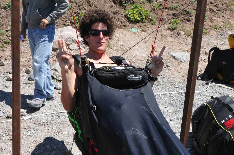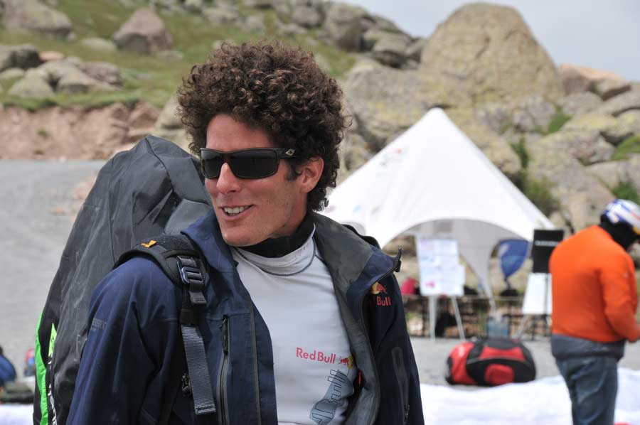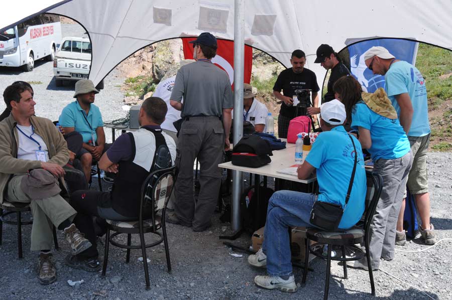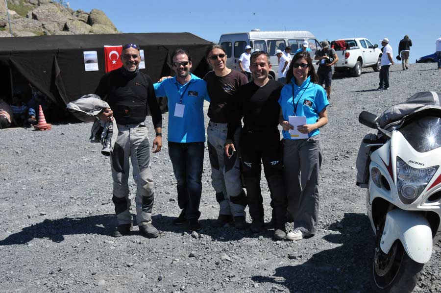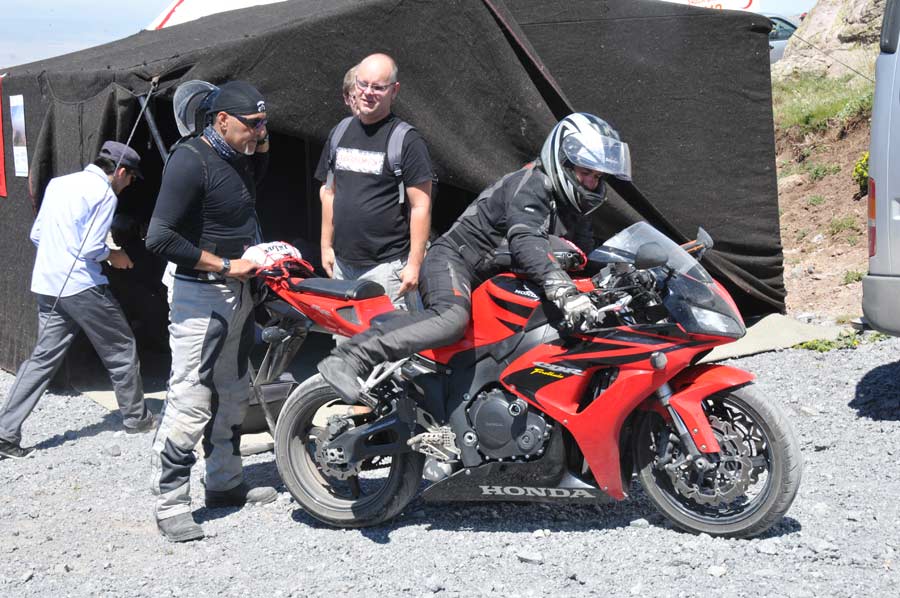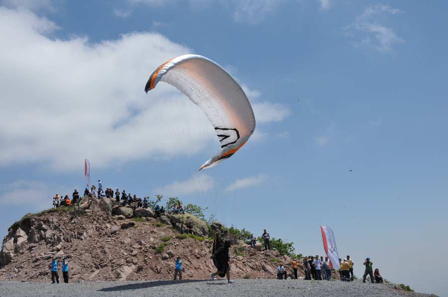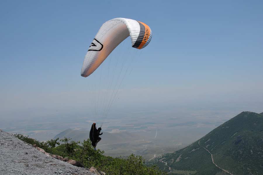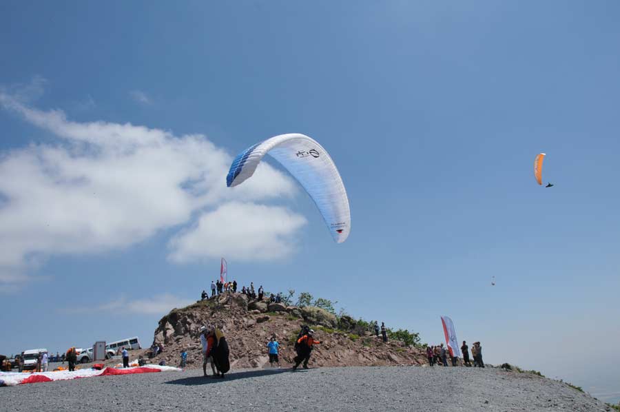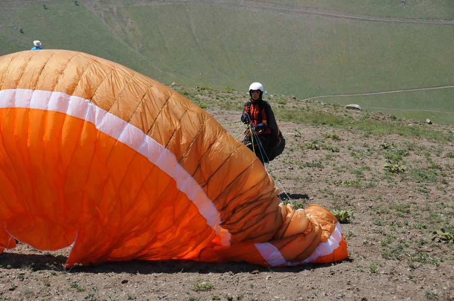 Am nächsten Morgen zum Frühstück waren dann etliche Gäste neben den Piloten und dem technischen Team im Hotel anwesend. Aufgrund der großvolumigen Motorräder aus Deutschland, die nun vor dem Hotel parkten, war auch ein interessierter türkischer Motorradfahrer zum Frühstück gekommen und mit Cevdet in tiefe Gespräche verwickelt. Pünktlich um 9.00 Uhr fuhren wir dann mit unseren Fahrzeugen Richtung Karadag. In Begleitung unserer Motorradgruppe erregten wir schon auf dem Weg durch die Stadt viel Aufmerksamkeit. Am Startplatz angekommen wurden schnell die Technik zur Funküberwachung, zur Pilotenerfassung sowie alle weiteren zum Start notwendigen Einrichtungen hergestellt. Kurze Zeit darauf kam dann der Gouverneur von Karaman im Dienstfahrzeug mit großem Gefolge zum Startplatz. Nach kurzen Einführungen und Erläuterungen durch die Veranstalter, zu dem sich zwischenzeitig auch die Toppiloten Pal Takats und Patrik Andre gesellten, wurden durch eine einführende Rede der Wettkampf offiziell eröffnet. Da es zunächst noch ungünstige Windbedingungen am Südstartplatz gab, wechselten wir zum Nordstartplatz über und nach und nach starteten die Piloten in den ersten Wettkampftag. Gegen Abend wurde Pal Takats mit einer Weite von 116 Kilometern als Tagessieger festgestellt.