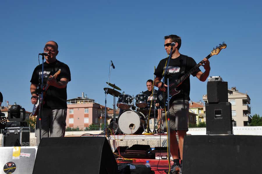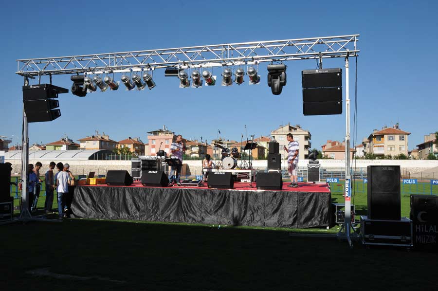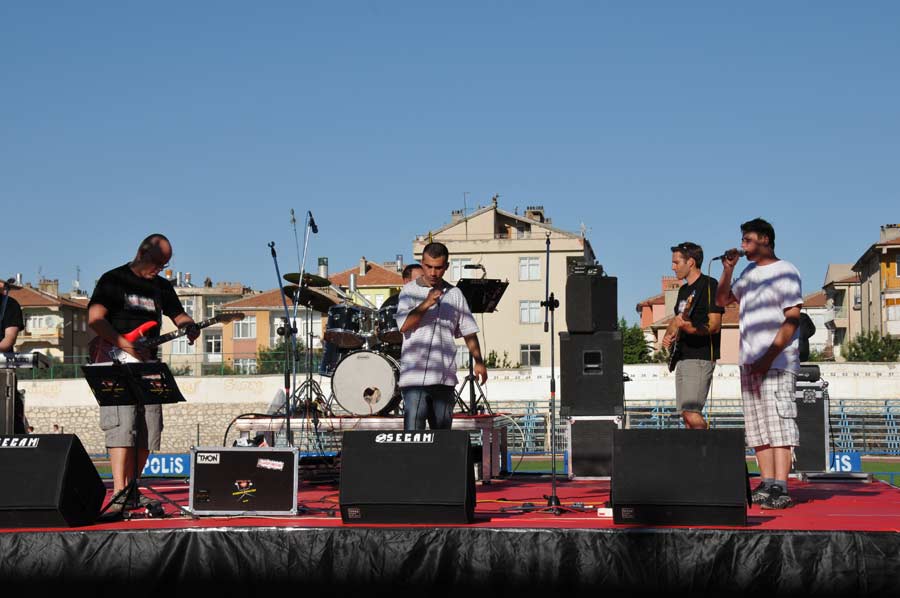 Zwischenzeitig fuhren wir mit der Gruppe Backdoor Connection und den Rap Musikern Kodes und Serin ins Fußballstadion von Karaman, wo bereits eine Firma aus Konya eine recht professionelle Bühne mit Lichtanlage und Stage Equipment aufgebaut hatte. Kurze Zeit später waren die Arbeiten beendet und die Band konnte mit dem Soundcheck beginnen. Nach zunächst ersten Abstimmungsproblemen aufgrund von sprachlichen Missverständnissen wurden dann schnell die optimalen Einstellungen am Mischpult gefunden und fixiert. Auch für Serin und Kodes wurden gleiche Aktivitäten vorgenommen und so konnte der Soundcheck schon nach einer Stunde erfolgreich beendet werden. Zu einer kurzen Dusch- und Abendessenspause ging es dann zum Hotel zurück.