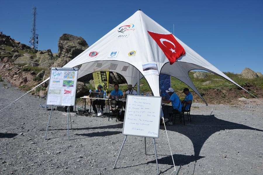 Gestern wurde ein großer Zeltbaldachin aufgebaut, was bei starken vorherrschenden Nordwinden gar nicht so einfach war. Auch die Toilettenanlagen wurden geliefert und aufgebaut. Von der Firma Telpost war ein Ingenieur auf den Karadag gekommen, der eine drahtlose Kommunikationsanlage aufgebaut und getestet hat. Für uns eine riesige Hilfe, können wir doch jetzt die Fahrer in ihren Pick ups zur Rückholung der Piloten viel direkter schon während des Fluges einweisen und damit schon auf dieReise zur Rückholung schicken, was die Wartezeit der Piloten am Landeplatz natürlich stark verkürzen wird. Hier sind auch letzte abschließende Gespräche mit der Jandarma geführt worden, die bei der Rückholung der Piloten tatkräftig unterstützen werden. Auf der Basis der bei allen Piloten vorhandenen GPS Geräte werden die Koordinaten an unsere Sammelstelle geschickt, diese gibt dann reale Positionen an die Fahrer aus und bei Landungen im Gelände wird die Jandarma dann für die Rückführung der Piloten bis zum nächsten Sammelpunkt sorgen. Eine Einbindung die man gar nicht hoch genug ansetzen kann. Insgesamt sind alle Jandarma Bereiche im Umkreis von 300 Kilometern um Karaman und Mut involviert.