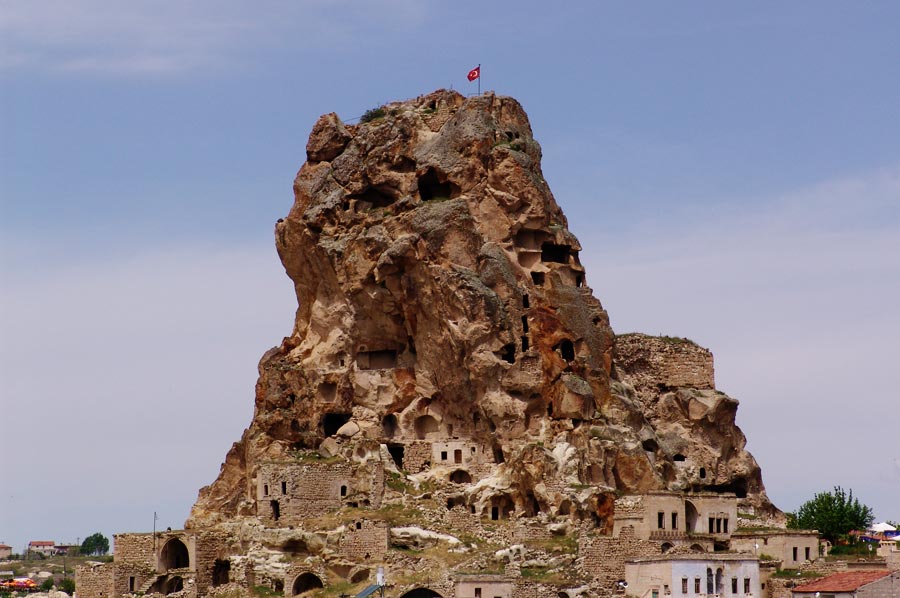 Ein Gegenstück zu den unterirdischen Städten bilden während Ihrer Kappadokien Reise die sogenannten Burgen oder Burgberge, beispielsweise von Uçhisar oder Ortahisar. Hier handelt es sich um 60 bzw. 90 m hohe Felsen, die ebenfalls von einem Gewirr von Gängen und Räumen durchzogen sind. Durch Abbrüche infolge von Erosion und Erdbeben liegen Teile davon heute offen. Auch sie dienten als Rückzugsräume bei Gefahr und konnten mit gleichartigen Verschlusssteinen wie in den unterirdischen Städten abgeriegelt werden. Sie boten etwa 1000 Menschen Zuflucht. Die ebenerdig liegenden Höhlen sind inzwischen zum Teil in vorgebaute Häuser integriert und dienen bis heute als Stallungen und vor allem Lagerräume.