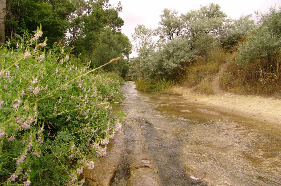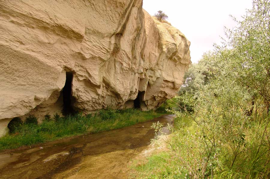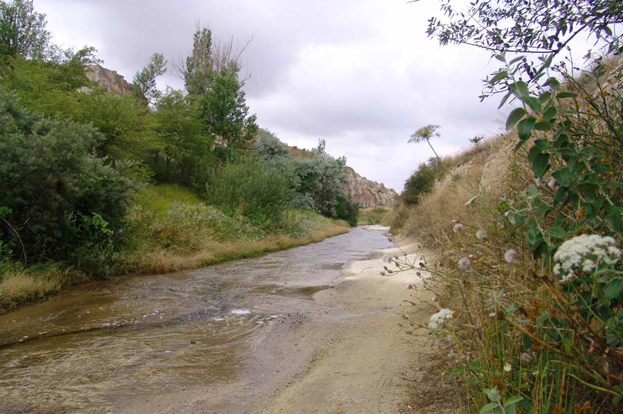 Nach einem ausgezeichneten Frühstück ging es am nächsten Morgen los. Unser erstes Ziel war das Üzengi Tal, etwa 12 km außerhalb von Ürgüp. Mit dem Auto fuhren wir zunächst in Richtung Mustafapasa bis zur Taleinfahrt. Einem Bachlauf folgend, konnten wir mit dem Fahrzeug noch einige Kilometer zurücklegen. Schnell war ein neuer Begriff für unsere Aktivität gefunden: „Autorafting“. Kurz vor dem Erreichen einer in der Region bekannten Quelle, die kohlensäurehaltiges Wasser spendete, ließen wir das Fahrzeug stehen und gingen zu Fuß durch das Bachbett in das Tal hinein.