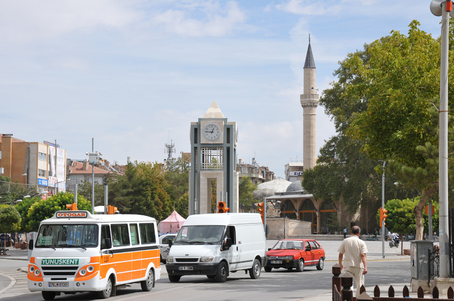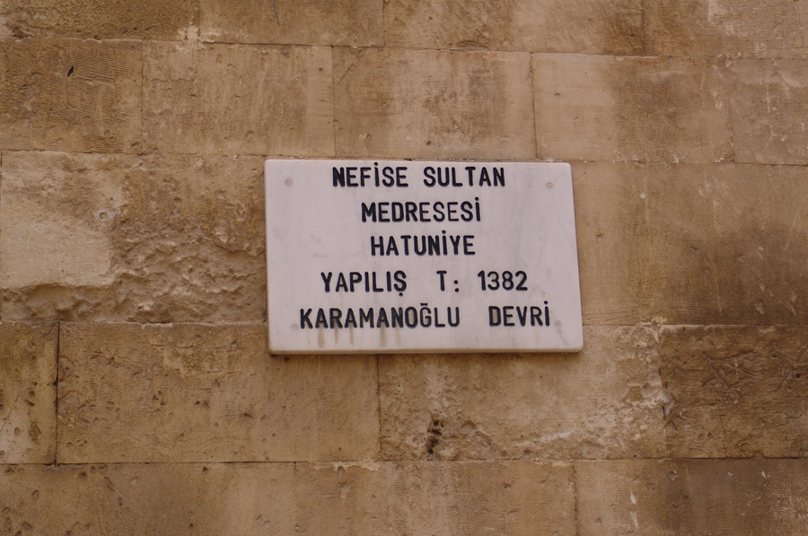 Fährt man vom Bahnhof in Richtung Stadt stößt man auf die Hatuniye Medresesi von 1382, eine der berühmten theologischen Hochschulen der Karamanidenzeit. Besonders beachtenswert ist das stattliche Eingangsportal, das durch reiche Schrift- und Ornamentbänder eingerahmt ist. Geometrische Muster und Bordüren mit lotusblättrigen Mustern, Akanthusblättern und dreiblättrigen Palmetten als häufigste Motive dokumentieren die Vielfalt seldschukischer Ornamentik. Ergänzt werden sie durch Schriftbänder und Koransuren, die in das Flechtwerk eingebunden sind. Im Zwickel findet man auch die Bauinschrift und den Namen des Architekten. Der restaurierte und heute wieder zugängliche Innenhof war ehemals überdacht. Die Arkaden werden von antiken Säulen unterschiedlicher Ordnung gestützt.