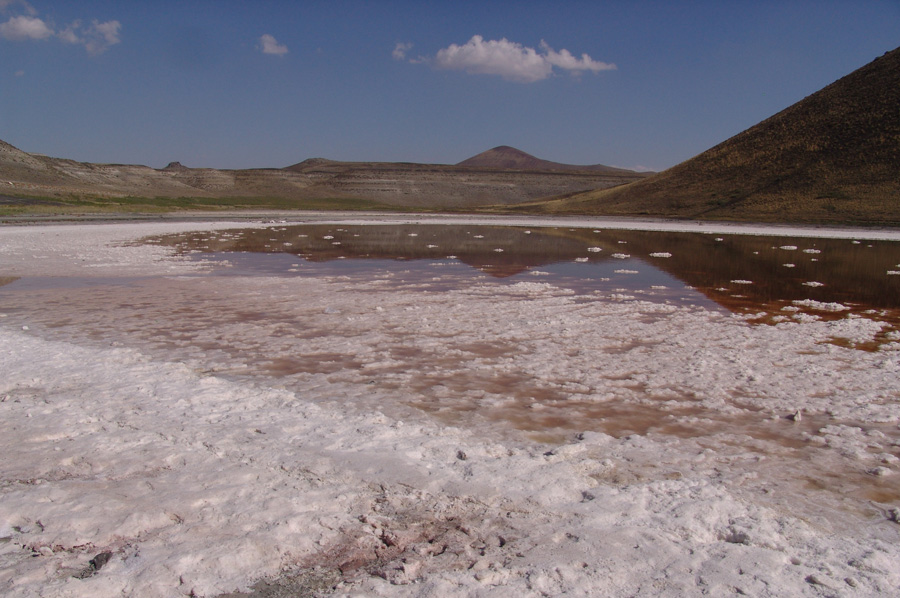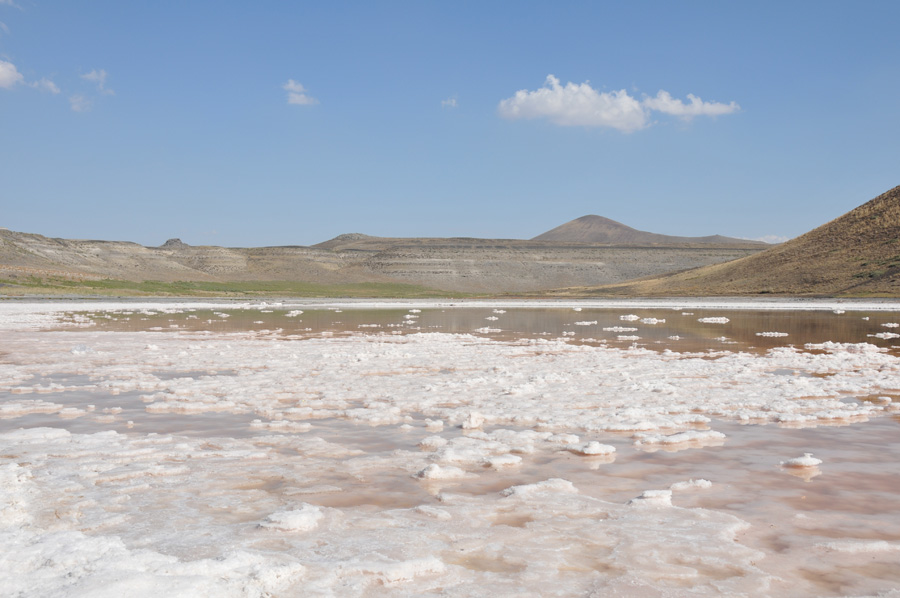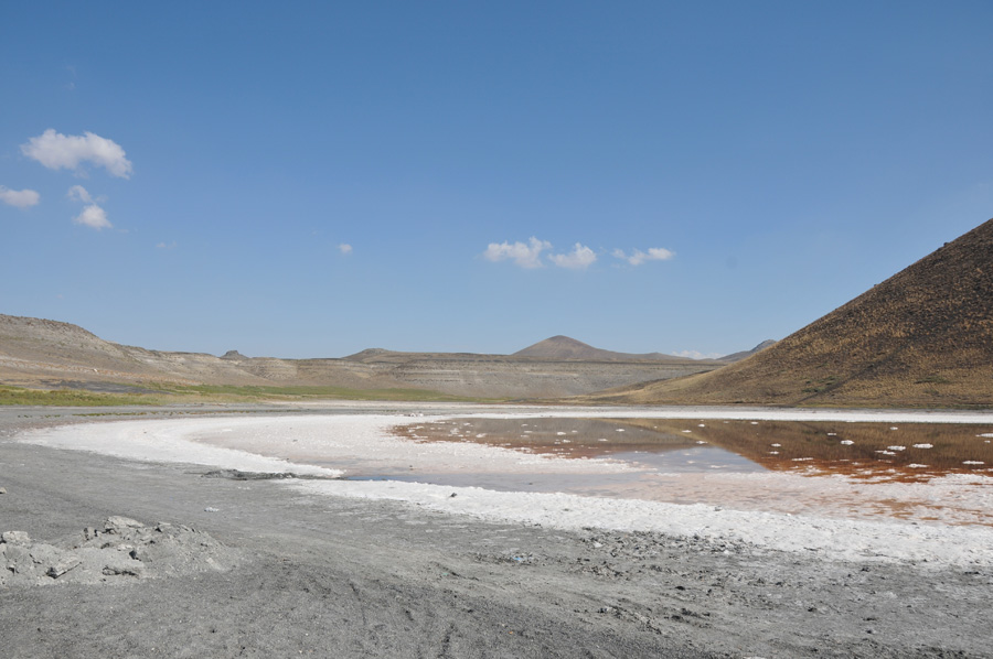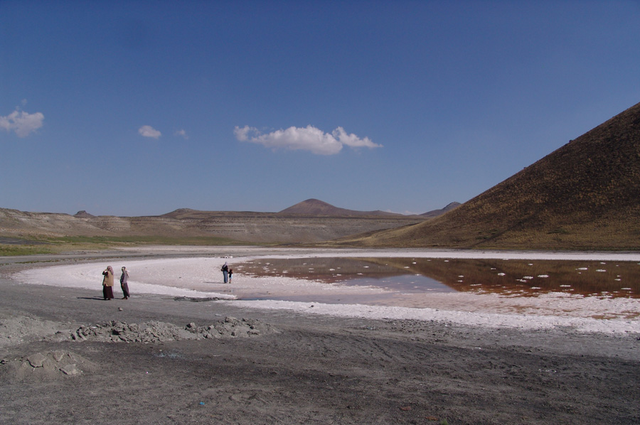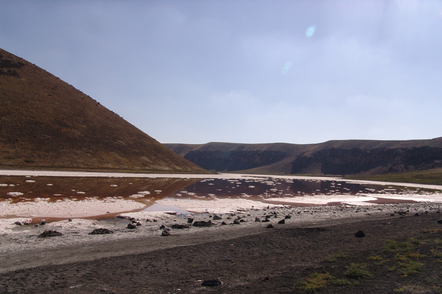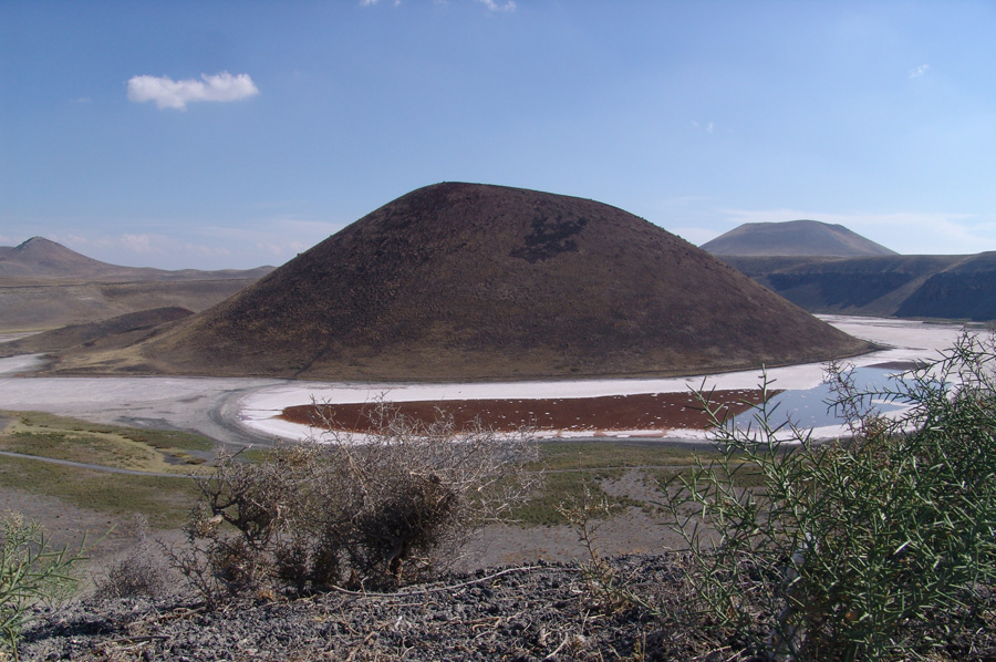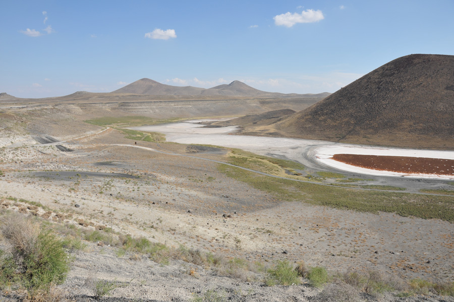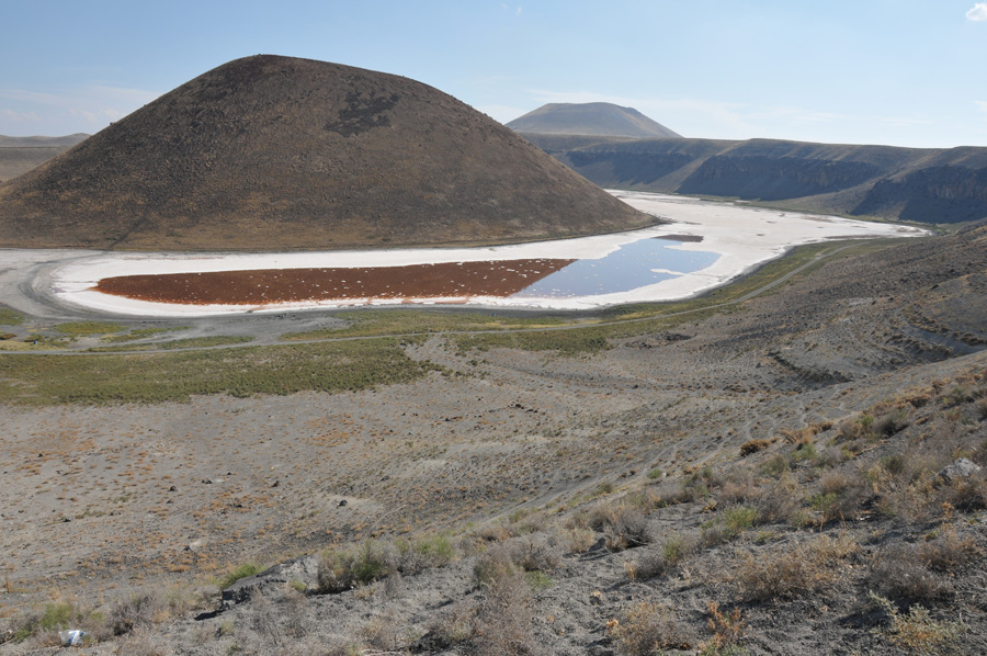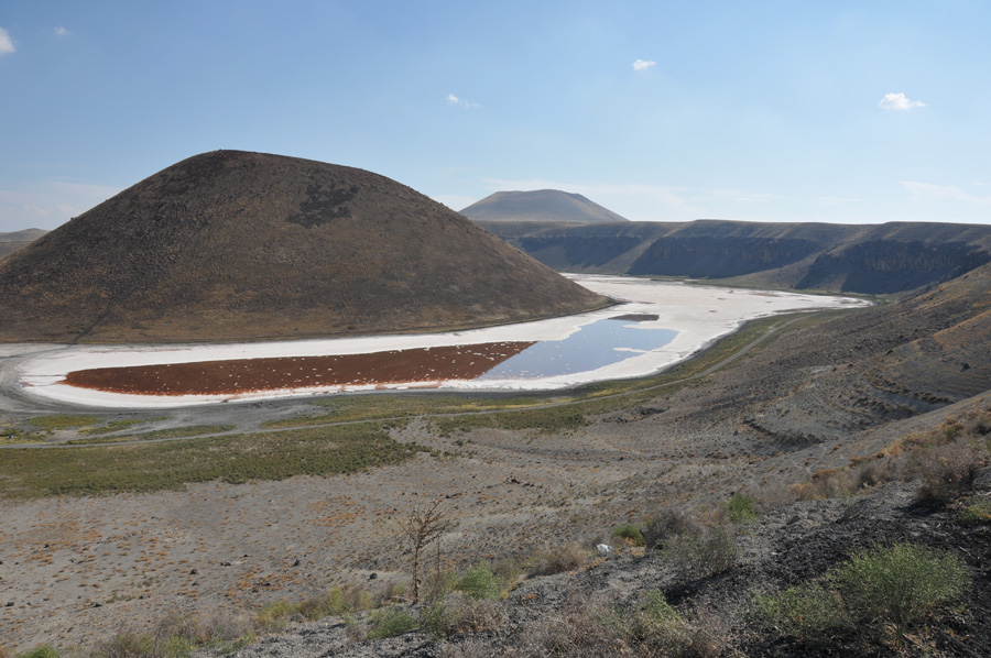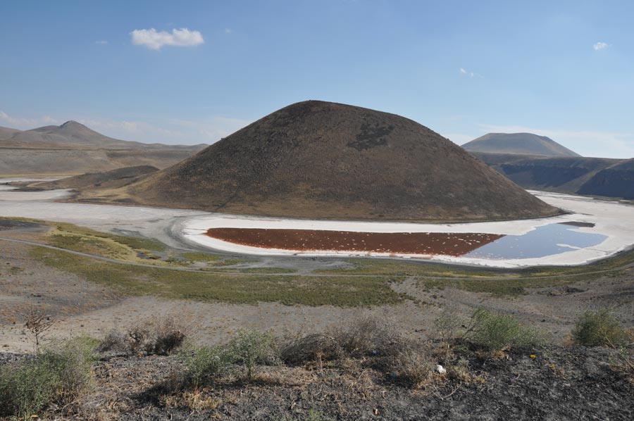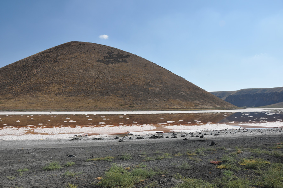 Wir fuhren zurück nach Ereğli um auf der Schnellstraße 330 Richtung Karapinar und Konya zu den Kraterseen des Meke Gölü und des Aci Gölü zu gelangen. Nach etwa 30 Kilometern erreichen wir zunächst den Aci Gölü, einem Ellipseförmigen Kratersee, der zum Karacadağ-Vulkanmassiv gehört, einem vulkanischen Bereich Zentralanatoliens von 30 Kilometer Länge und 15 Kilometer Breite. Wenig später schon erreichen wir ein weiteres Wunder dieser Erde: den Vulkankrater Meke.