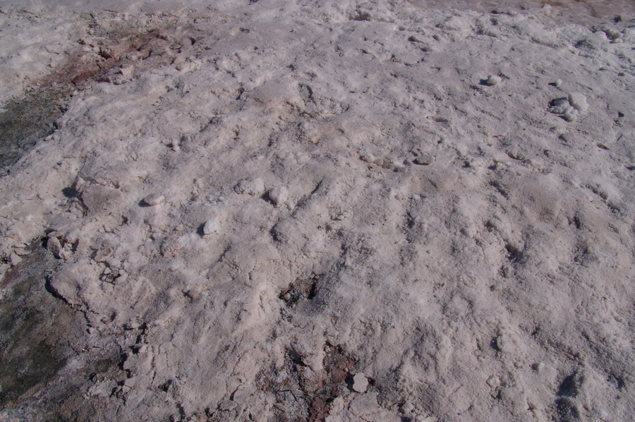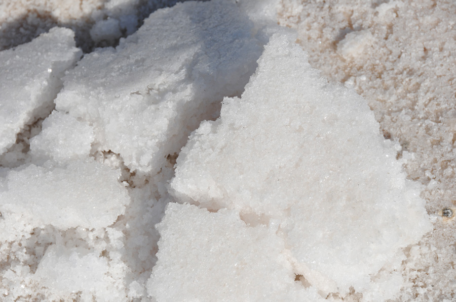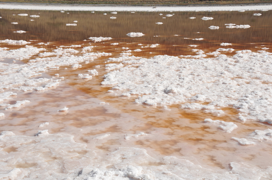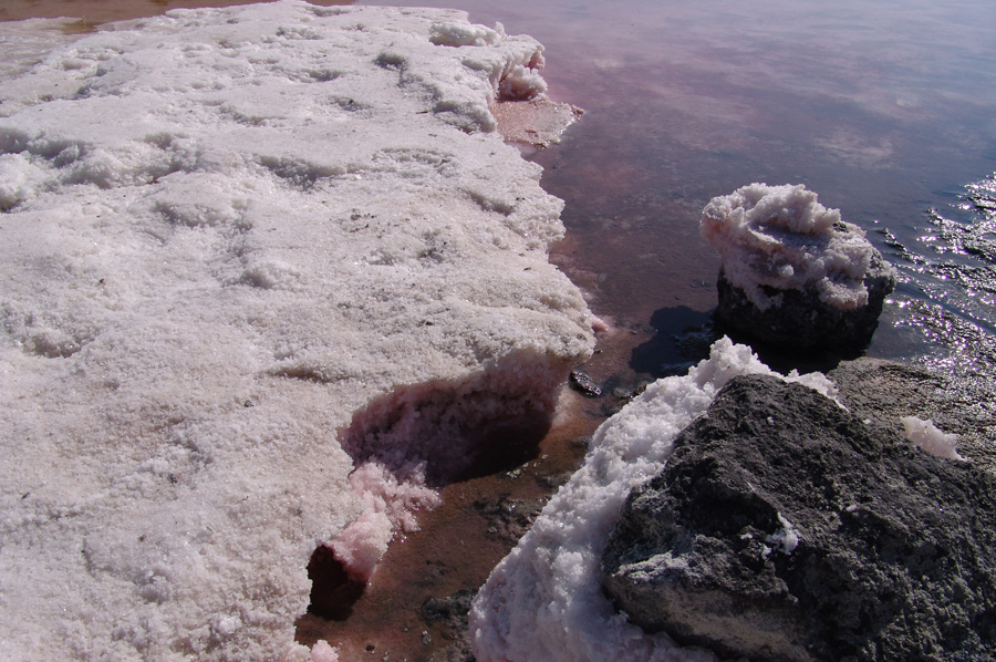 Wohl einzigartig auf der Welt ist das sich uns eröffnende Bild als wir die Hauptstraße verlassend auf schmaler Piste zum Kratersee fahren. Beim Ausbruch des Vulkans hier hatte sich ein riesiger Krater von ca. 1.500 Metern Durchmesser gebildet. Im Laufe der Jahre entstand so ein riesiger Kratersee. Ein zweiter Vulkanausbruch schuf dann in der Mitte des Sees einen neuen Vulkankegel, der in der Höhe weithin sichtbar weit über den Rand des Kratersees herausragt. Ein Vulkankegel aus basaltischer Lava und Vulkanitgestein Rhyolith in einem Kratersee, dessen Wasser in der Sonne grünlich glitzerte. Ein einzigartiges Naturwunder, das uns veranlasst bis an den See hinab zu gehen. Interessant geformte Salzkristallablagerungen knirschen unter den Schritten als wir an den Rand des Sees kommen. Grauschwarze Vulkanasche im Gegensatz zu fast strahlend weiß schimmernden Salzkristallen aus Natrium, Kalium, Magnesium aber auch Chlor.