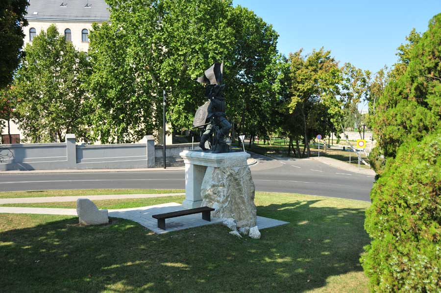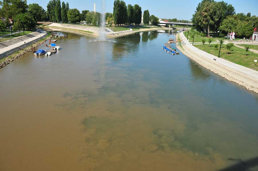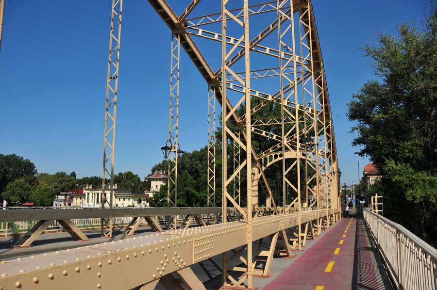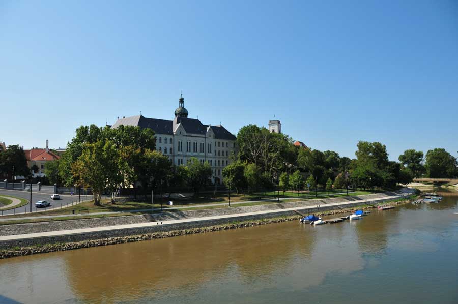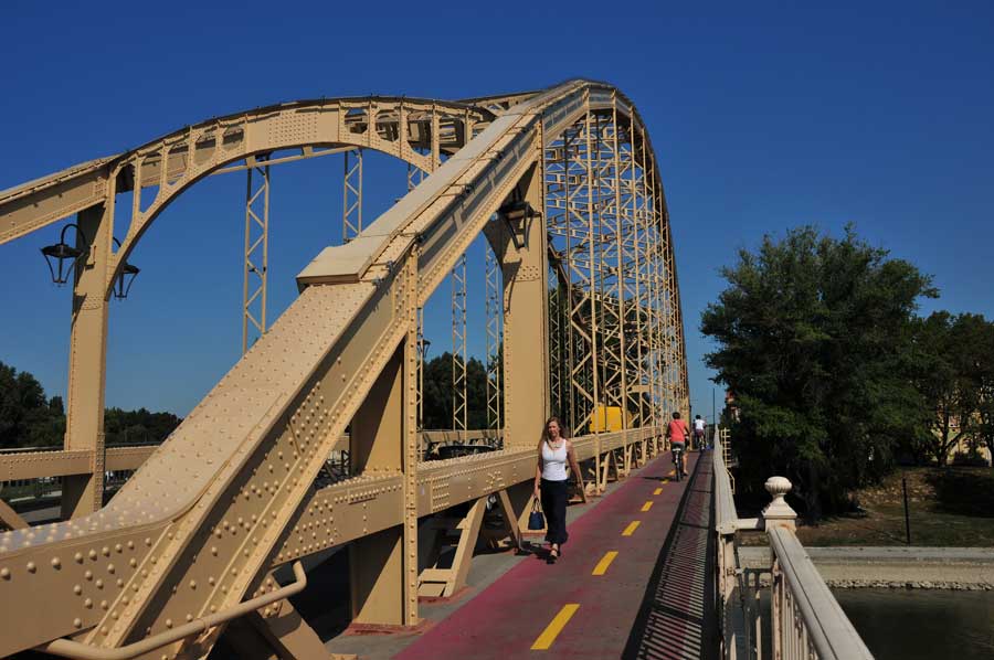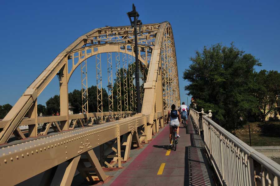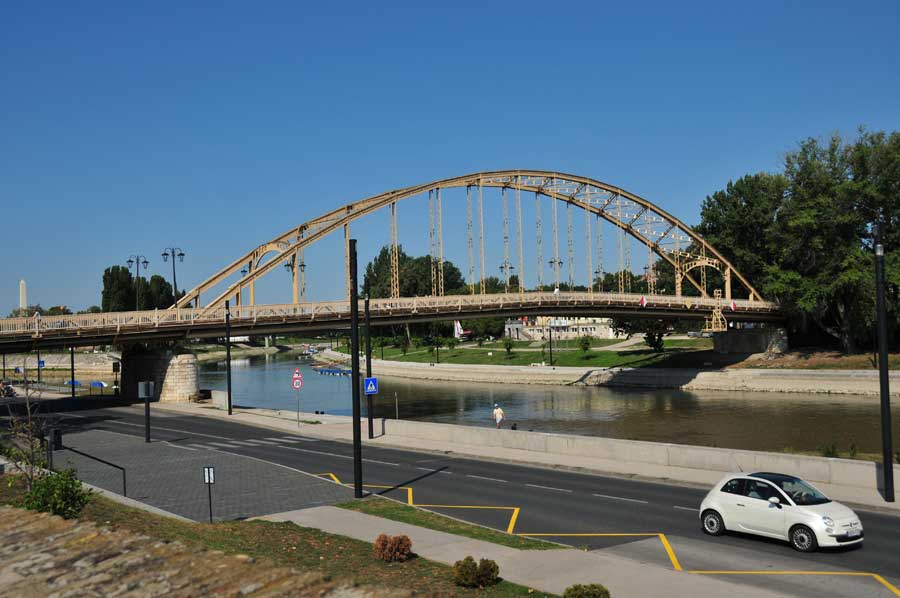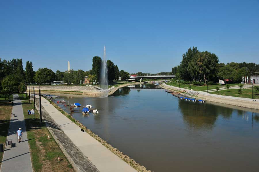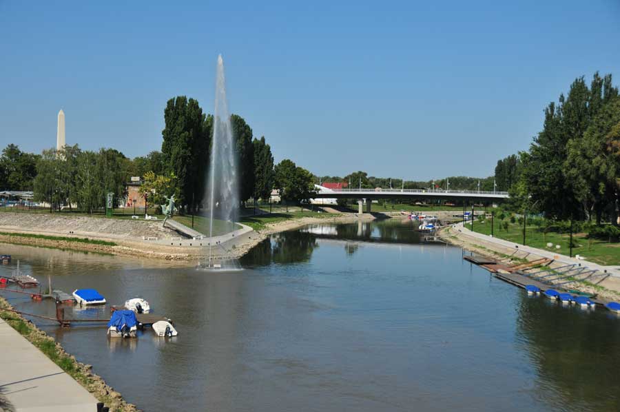 Wir überquerten die Raab über eine moderne Straßenbrücke, sahen dann etwas flussabwärts auch bereits das Zusammenfließen von Raab und Rabatz, dahinter eine mächtige Bogenbrücke, die zunächst unser Ziel war. Die idyllische Uferpromenade ist mit Schatten spendenden Bäumen gesäumt, ein kleines Theater schien für Veranstaltungen vorgesehen zu sein, auch eine weitere Fahrradleihstation fanden wir vor. Neben der Fahrbahn der Bogenbrücke ein Radweg, der in den Vorort von Györ führte. Uns fiel auch eine dreiarmige Wassersprühanlage für Fußgänger direkt am Brückenbeginn auf, die kühlendes Nass auf die Passanten versprühte. Weitere dieser Stationen gab es auch in der Innenstadt.