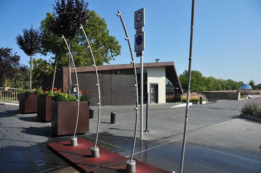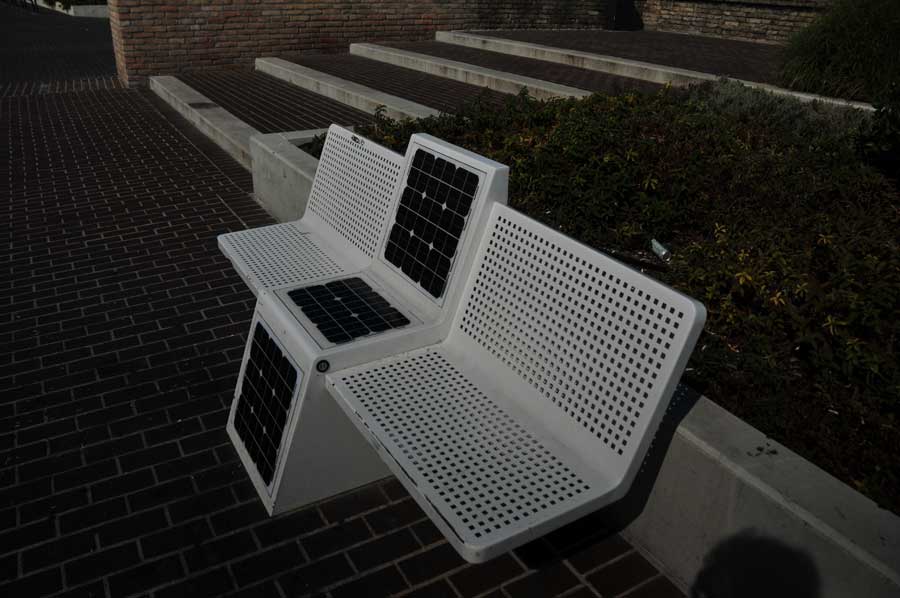 Ein zunächst in seiner Funktion unklarer. großer Platz direkt im Anschluss an die Bogenbrücke zeigte sich dann als modernes Parkhaus mit einer futuristischen Einfahrt, die wir uns näher betrachteten. Überhaupt gab es einige sehens- und nennenswerte Details, die auch unseren Städten gut tun würden: so gab es Parkbänke, die über kleine Solarflächen verfügten, die zum Aufladen der Mobiltelefone eingerichtet waren. Tolle Idee und super umgesetzt.