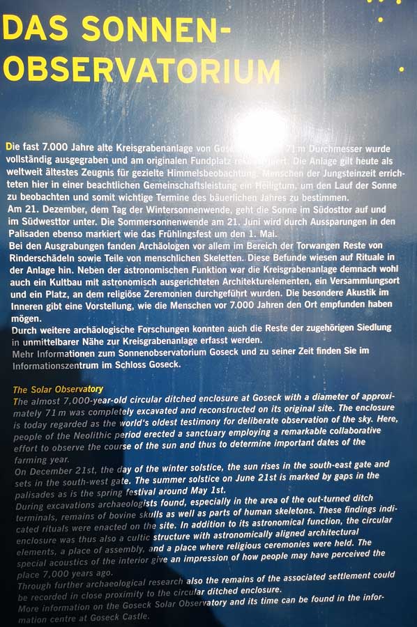 Schon mehrfach hatte man uns von der Kreisgrabenanlage unweit des Schlosses von Goseck erzählt, nun sollte das besser unter dem Begriff „Sonnenobservatorium“ bekannte antike Bauwerk erwandert werden.