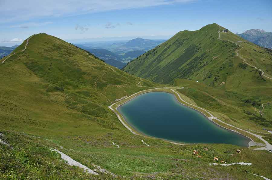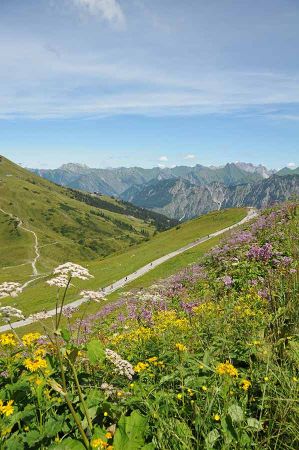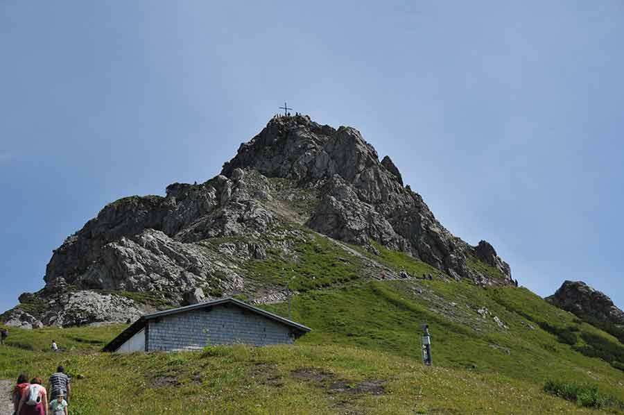 Sehr gut erkennbar sind von hier oben die Wanderwege als lang gestreckte Pfade an den Berghängen, die einzelnen Liftanlagen für die Skisportler im Winter sowie die Verbindungswege zum Fellhorn. Ein imposantes Gelände, das nicht nur im Winter tausende Besucher anlockt, wie wir auf dem Gipfel bei einer weiteren kleinen Vesper bemerken. Im Gelände hingegen verläuft sich die große Zahl der Bergwanderer aber recht schnell, denn das Gelände ist sehr weiträumig. Erst bei den Hütten gibt es ein erneutes Zusammentreffen der Wanderfreunde. Für die kommenden Tage haben wir auch weitere Wanderungen eingeplant, vielleicht auch vom Fellhorn- oder von der Kanzelwand aus.
