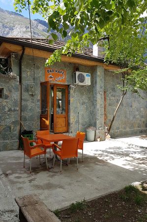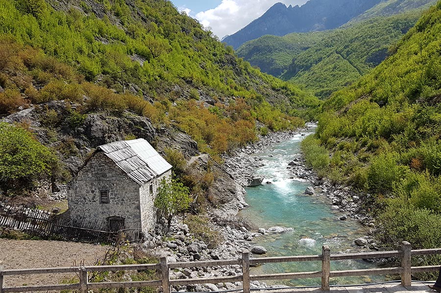 Nach unserem köstlichen Mittagsmahl sollte es dann Richtung Hotel gehen, zunächst bis zur Straßengabelung an der Brücke über den Cem-Fluss. Der Weg ist gut markiert und es gibt einige Fotopoints unterwegs. Besonders spannend ist je nach Jahreszeit der Übergang über die Hängebrücke. Die Anstiege sind ok, sind damit ein gutes Training für die größeren Höhendifferenzen im Valbona Tal. Wir erreichen unsere Unterkunft für die Nacht nach gut 4 Stunden Wanderung.