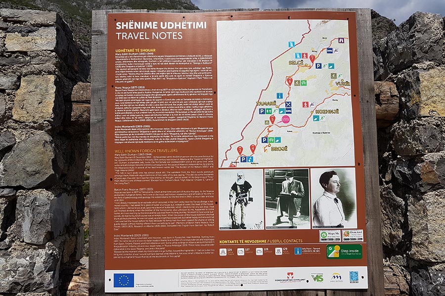 Wir waren damals dem Flusslauf auf der 2014 asphaltierten Straße bis Tamarë gefolgt, wo wir letztendlich auf die erste Kennzeichnung des neu einzurichtenden Wanderwegs „Peaks oft he Balkans gestoßen waren. Hier hatten wir auch das Ende der bis dahin neu asphaltierten Straße erreicht.
