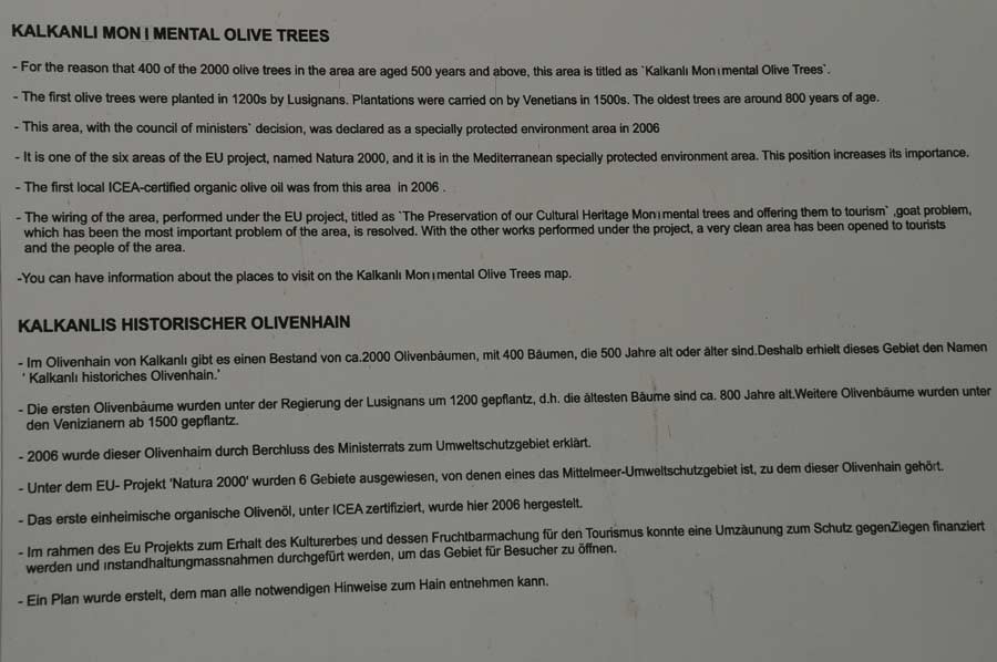 Hier stammen die ältesten Bäume aus Pflanzungen der Lusignans aus dem 12. Jahrhundert, viele weitere Bäume wurden von den Venezianern gepflanzt. Der älteste bekannte Olivenbaum weltweit wird auf 4000 Jahre geschätzt, da das Innere des Baumes allerdings fehlt, geht man von mindestens 2000 Jahre aus, dieser Baum befindet sich in Vouves, auf Kreta in Griechenland. Ein weiterer sehr alter Olivenbaum befinden sich in Tarragona, Spanien und ist über 1700 Jahre alt, ein weiterer 1200 Jahre alter Baum steht in Castellón.