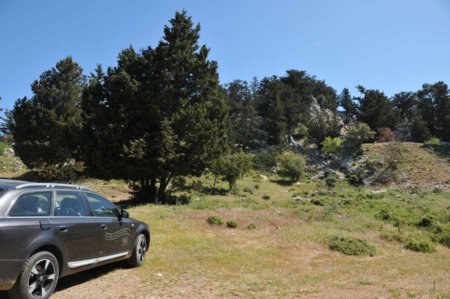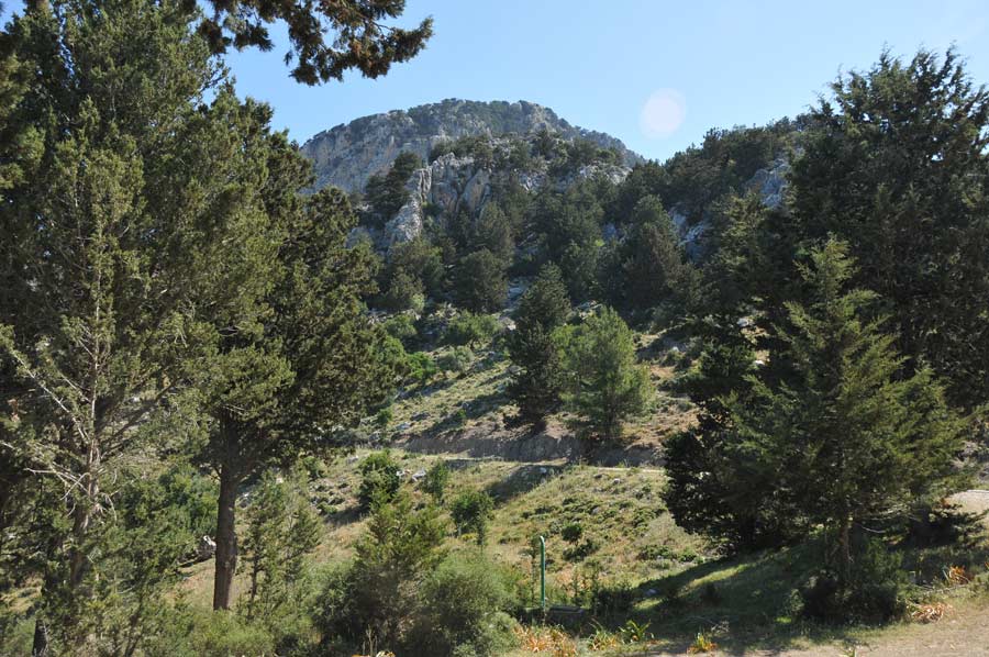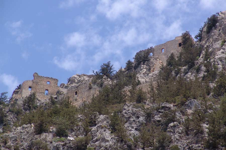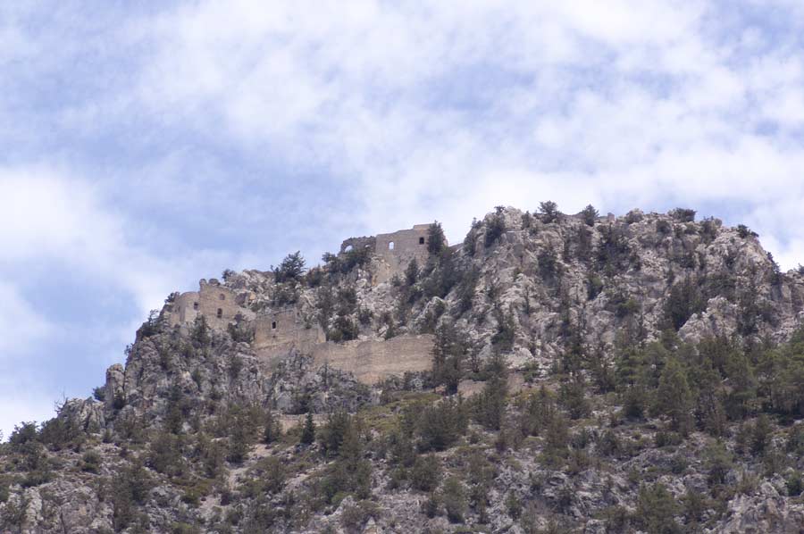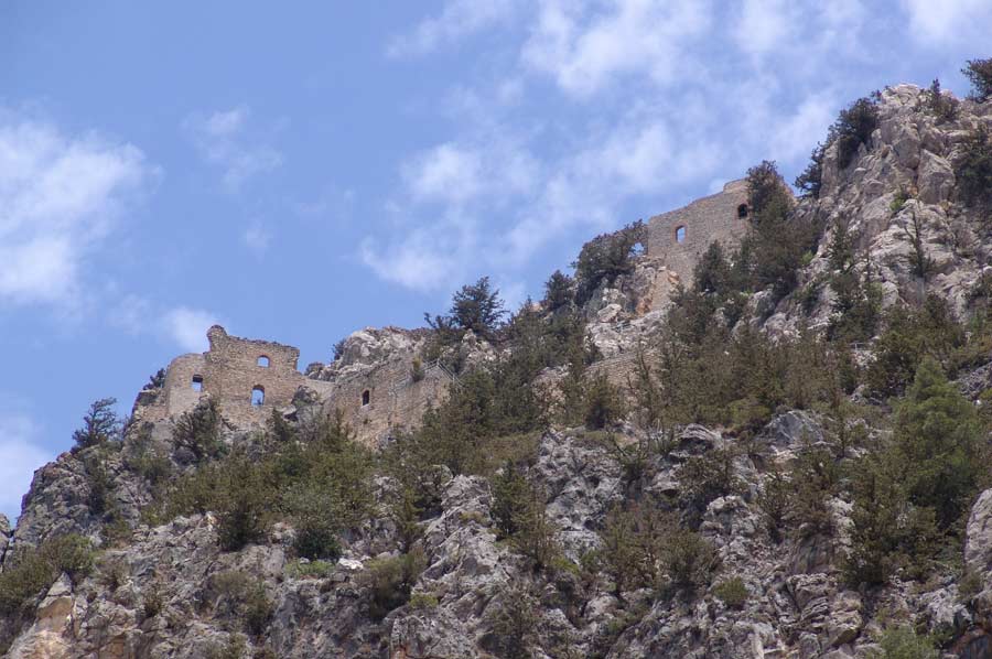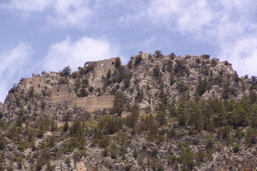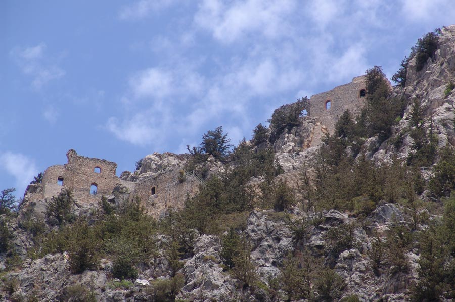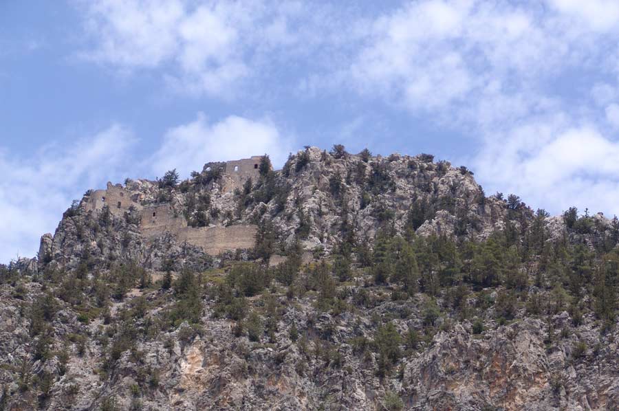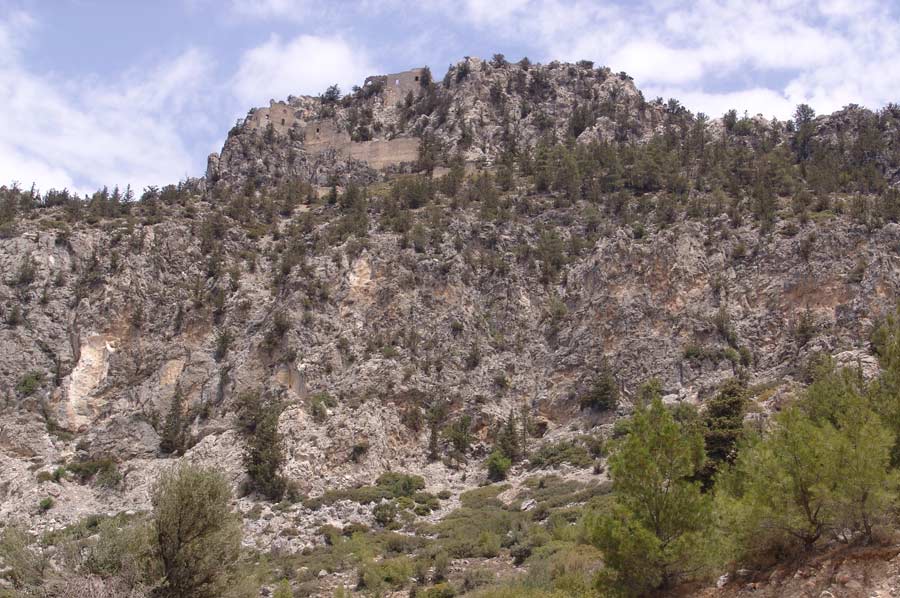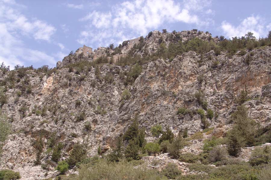 Mit dem Auto gelangen wir bis zu der Passhöhe zwischen Girne und Famagusta, wo der Weg zur Burgruine abzweigt, der sich durchwegs am Südhang des Gebirges an lichten Baumbeständen von Pinien-, Lorbeer-, Pistazien- und Johannisbrotbäumen dahin schlängelt. Vom großen Parkplatz führt ein ca. 7 km langer, holpriger Waldweg, den man besser zu Fuß bewältigen kann, zu einem kleinen Plateau im Schatten eines Olivenbaums. Von hier geht es nur zu Fuß weiter steil bergauf zur Burgruine (etwa 40 minütiger Fußweg).