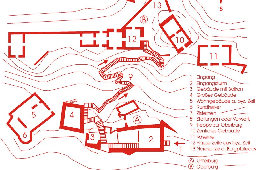 Nach doch anstrengendem Aufstieg (man sollte die frühen Morgenstunden oder kurz vor Sonnenuntergang nutzen) kommt man zum Eingangsturm, dem einzigen Zugang zur Burg. Die rechte Seite des Eingangsturms ruht auf angrenzendem Fels und im zerklüfteten Innenhof bewahren Stützmauern den Boden vor dem Abrutschen, die früher mit Zinnen bestückte Brustwehr an der Hangkante hat ebenfalls eine Stützfunktion. Zwei grob gemauerte über Treppenstufen zu erreichende Gebäude schließen sich an: ein quadratischer Bau mit Tonnengewölbe bietet einen langen Balkon über dem Abgrund, der größere, zweite Bau mit einem fast 50 m² großen Innenraum weist Öffnungen im Boden auf, vermutlich Zugänge zu Zisternen. Eine dritte Ruine stammt aus byzantinischer Zeit. Vom ursprünglich zweistöckigen Wohngebäude sind noch drei ebenerdige Räume identifizierbar. Ein Runderker formt die Südwestecke unmittelbar am Steilhang des einstigen Prachtbaus (Aussichtspunkt). Die dickwandigen Mauertrümmer einer Zisterne liegen gleich unterhalb des Felsabsturzes, ebenso die Reste eines einstigen Vorwerks oder Stallgebäudes. Im Erdgeschoss der Festung befinden sich Räume zur Vorratshaltung und zur Unterbringung der Bewohner mit darunter befindlichen Zisternen für das Trinkwasser. Ihr weiterer Weg führt Sie dann hinauf zu den Ruinen einer kleinen Kapelle von wo Sie den Atem raubenden Blick auf die umliegende Umgebung wahrnehmen können.