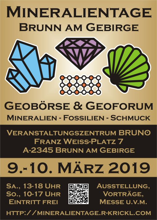 The Brunner Mineralientage is the official follow-up event of the spring exchange in the Wiener Stadthalle and continues the tradition of the major stock exchanges in Mödling and Baden. Venue is the new event center BRUNO with its modern facilities and the Brunner Heimathaus with its historic charm.
