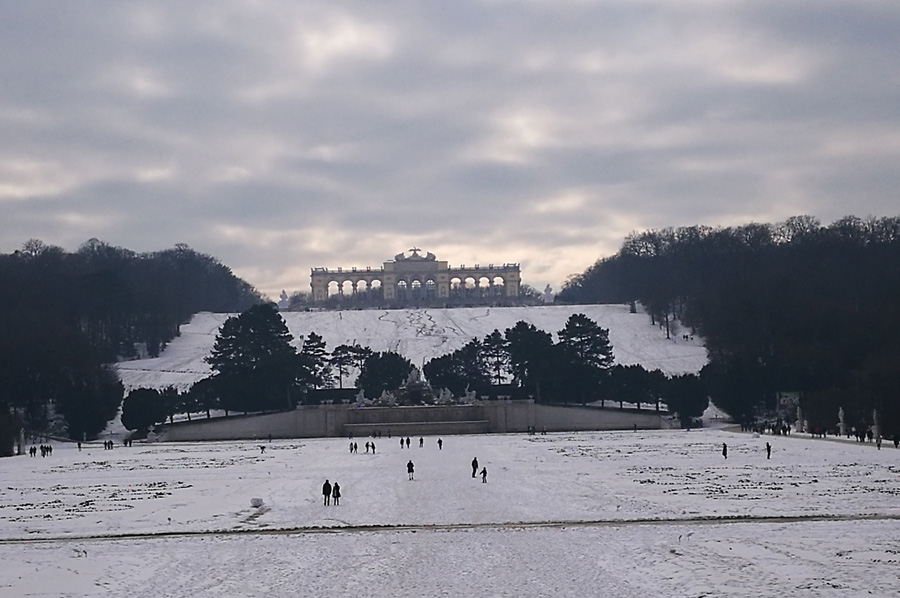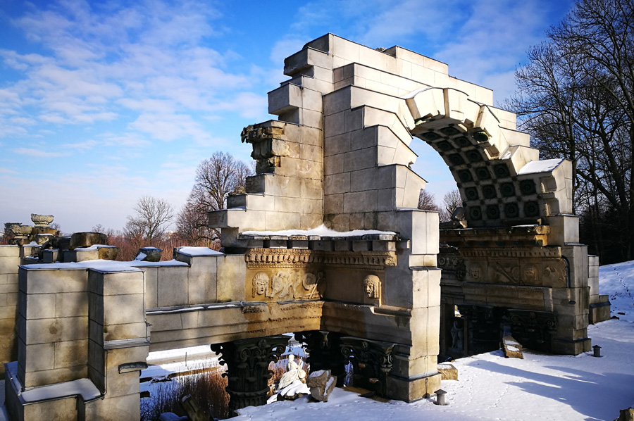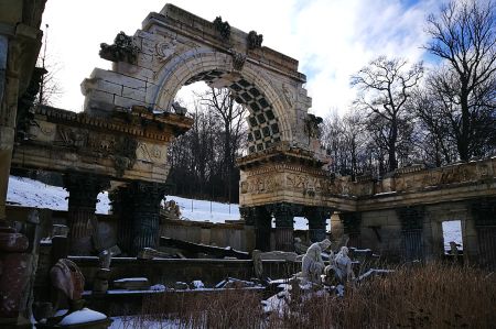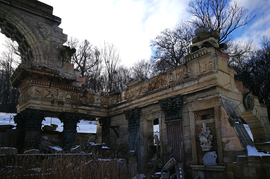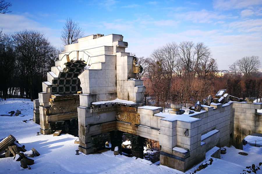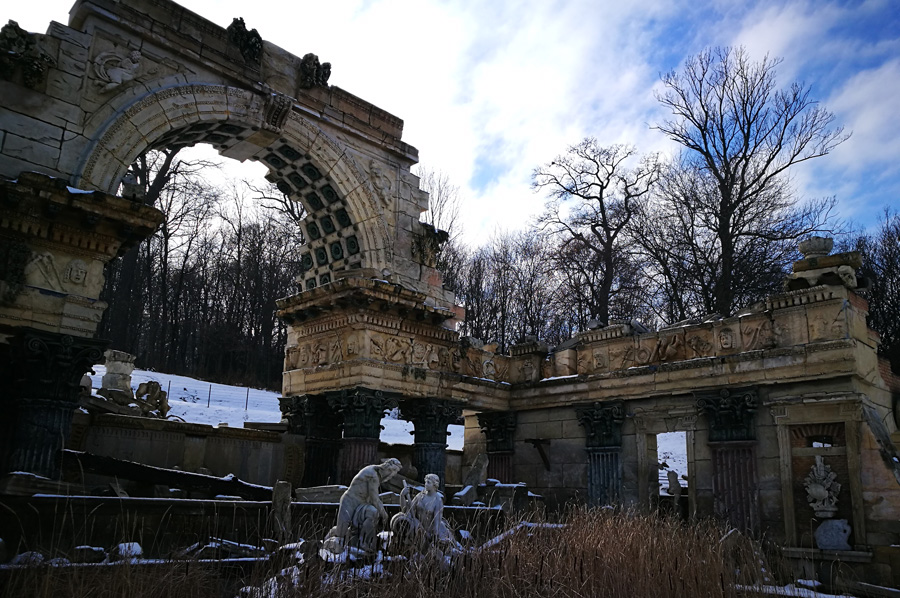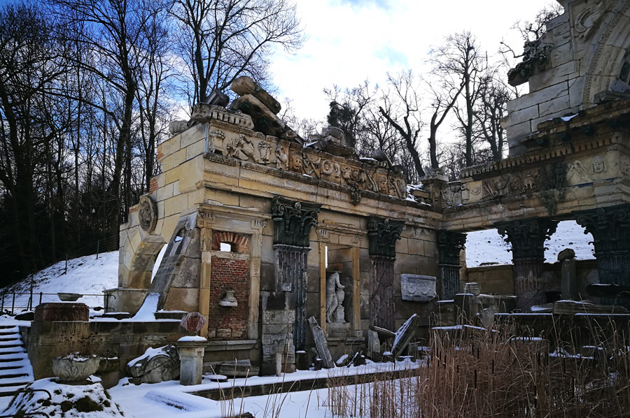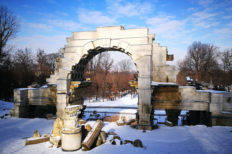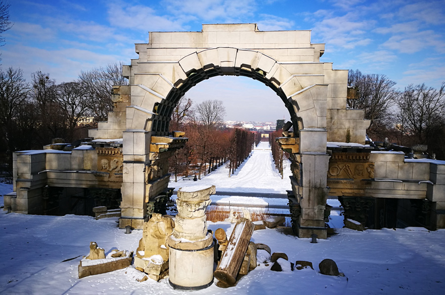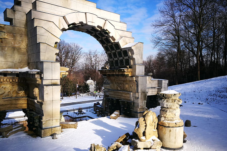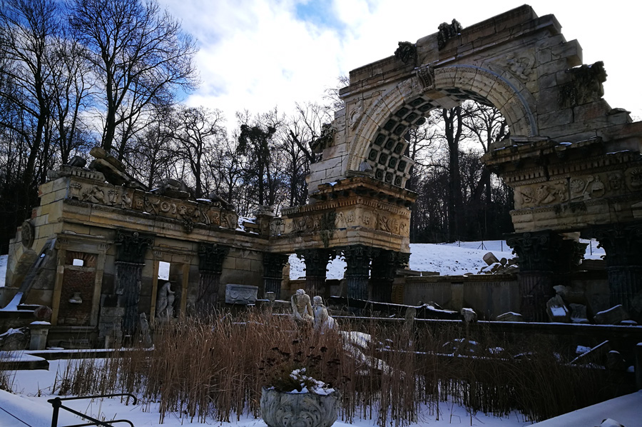Our path through the now snow-covered parking area also led us to the so-called Roman ruin, designed by Hohenberg and erected in 1778, and oriented to Piranesis depictions of the ruins of the Roman Vespasian-and-Titus temple. It was at first called the ruin of Carthage. During the restoration, which was completed in 2003, the original coloring was re-applied by means of a contemporary watercolor and the remaining colors on the stones.