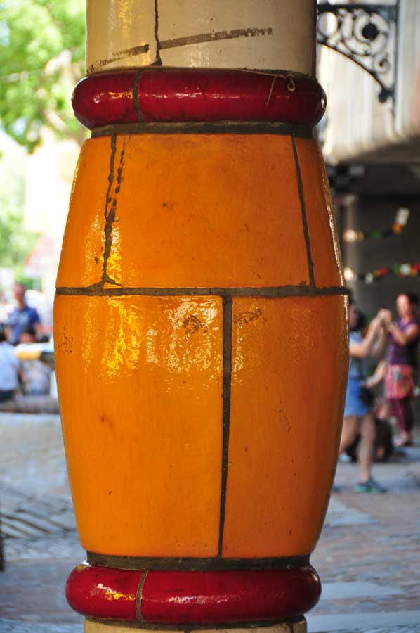 o Colorful ceramic mosaics, asymmetrical window frames