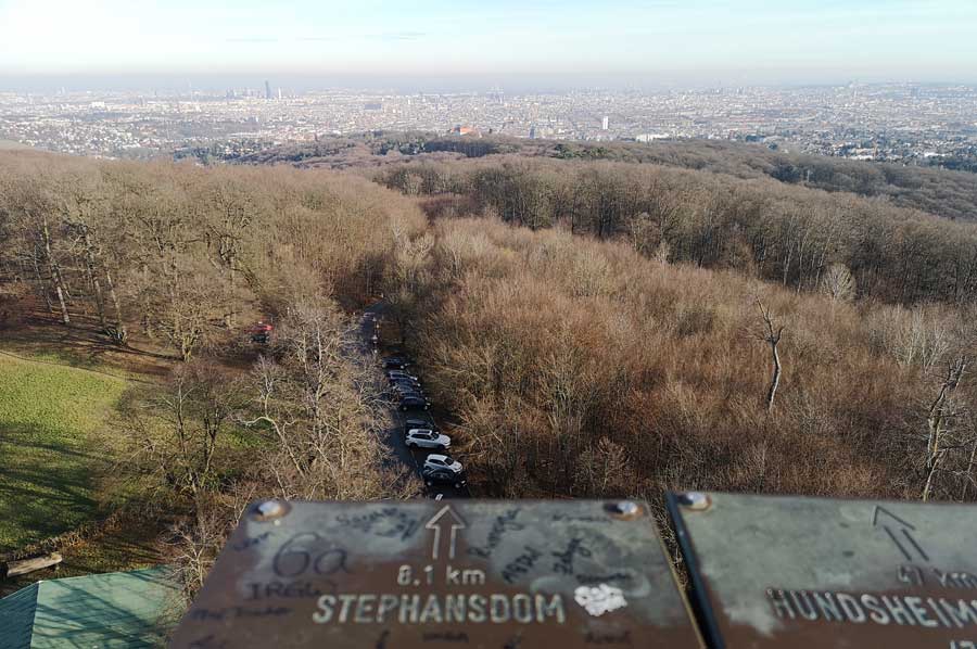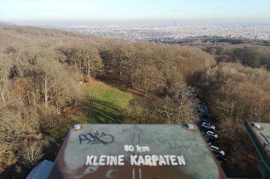 Already in the previous year we had visited the viewing platform once, but there was thick fog at the time, so that the view over the Vienna Woods and the city of Vienna remained hidden. On the observation deck at a height of 31 meters above ground you have, with good visibility, an excellent panoramic view to the west over the adjacent Vienna Woods and to the east over the Vienna city area. The stairs up to the observation deck are 90 cm wide and up to the platform there are 183 steps, not a small number for the inexperienced staircase users. On clear days, such as our current visit, the view over large parts of the Vienna Basin is outstanding. On the horizon then to the east of the Hainburger mountains and the Leithagebirge can be seen, in the south the Kalkalpen with the Schneeberg. On exceptionally clear days you can also see the White Carpathians in the northeast.