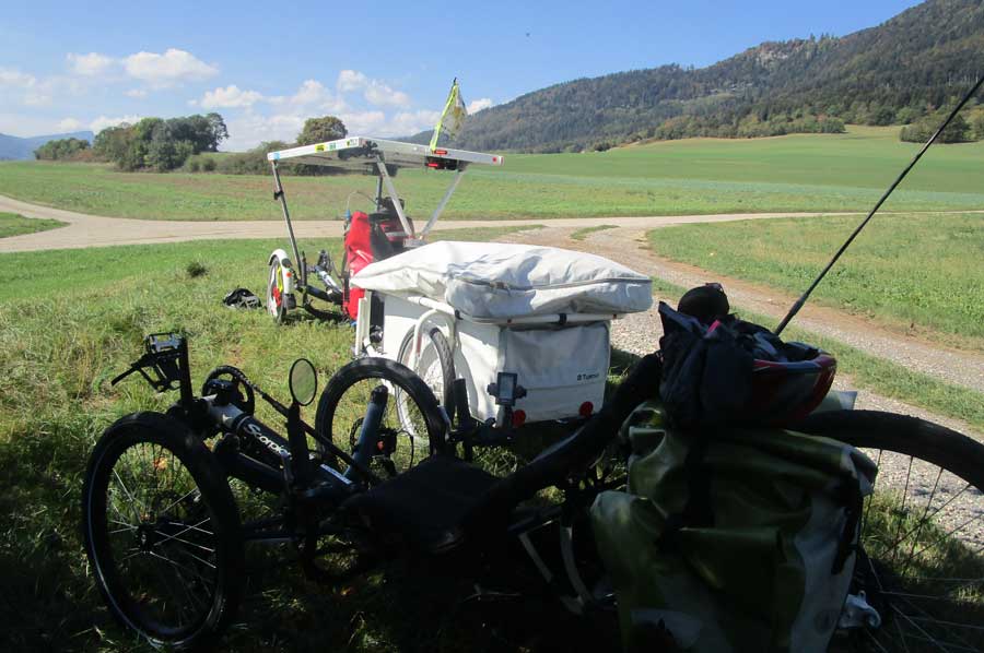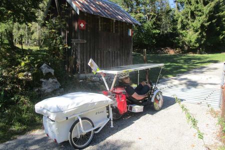 At first glance a bit unusual but neither too monstrous nor technically problematic, the E-Trike with roof and tent trailer. Jean-Yves runs a rental station for e-bikes in Switzerland and has to deal with the already mentioned discussion about sustainability and environmental protection. Recently, Jean-Yves is also the proud owner of a mini-caravan BTurtle, which was also purchased for loan. Of course he want to test equipment in the best case always first before renting it out to his guests. So it was clear that there should initially be a longer tour, where the mini-caravan was checked. Just a Weber clutch had to be mounted on the trike, the trike itself had long been ready for use.