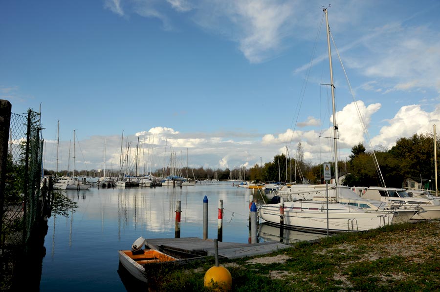 From the camper place in Staranzano, by the way, the Camper Club "La Foce dell'Isonzo" cared for and maintained, we drove into the center of Staranzano. Unfortunately, there is a small section along the road without bike path. Continue along Via Nazario Saura to Via Brasizza and Via Grapetta, which leads through fields and meadows on the outskirts of Monfalcone. Everything seemed fine until we came to the unfortunately closed bridge crossing the Canale Navigabile. Turning back and now along right on the outskirts of Monfalcone on the Via Bagni Nuova towards the coast. We take the opportunity to visit the port of Monfalcone.