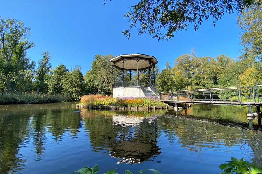 With its 47 hectares, Vondel Park is the largest park in Amsterdam and, with over 10 million visitors a year, also the most popular park and leisure facility. It was designed as a so-called English landscape garden with winding paths and ponds that are intended to create the ideal of a walk-in landscape painting. It is named after the Dutch writer Joost van den Vondel, whose monument was erected in 1867 in what was then called “Nieuwe Park” (New Park). But the residents of Amsterdam soon called the green space just Vondel Park. This name also became the official name in 1880.