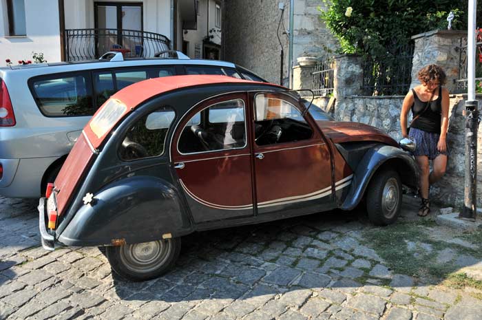 And how could it be different, we just arrived at the first intersection, we found the second favorite subject of Judith: a vintage car of the Citroen brand, this time a blue 2CV in the version as convertible.