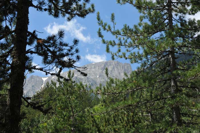 A first view of the massive cliffs of the summit of Olympus landscape.
