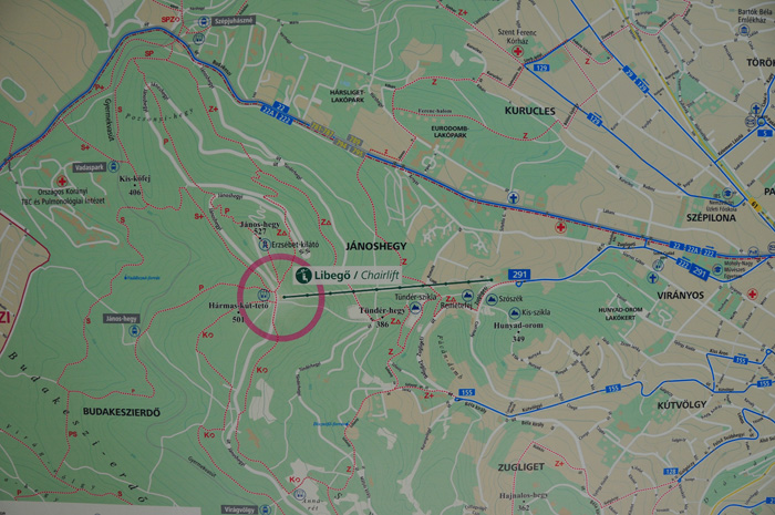 The chairlift crosses a height difference of 262 m. Route: Buda mountains, from Zugliget (at the terminus of bus line 291 from Moszkva tér) to the view of János mountain, with 526 m the highest point of Budapest.