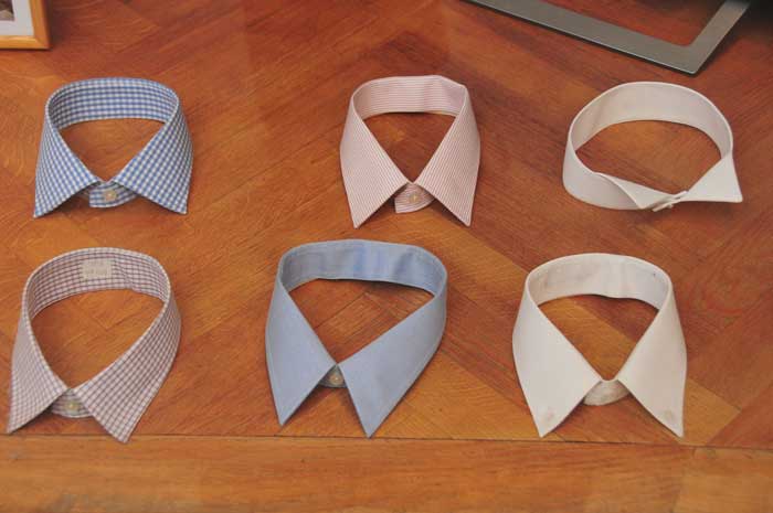 Old school of handicraft tailoring - here still shirts are made in the old style and offered for sale, in the shop display the different collar types for the shirt types.
