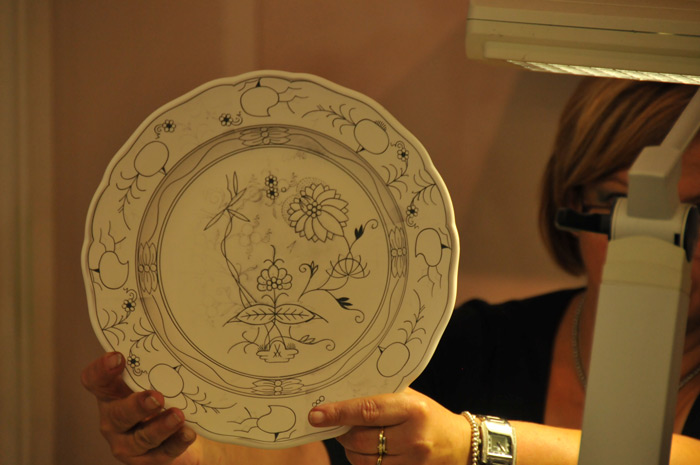 The porcelain colors are applied with very fine brushes, with magnifying glass painting also with single-hair brushes. Coloring templates were used for all illustrations.