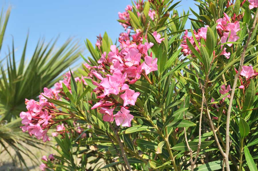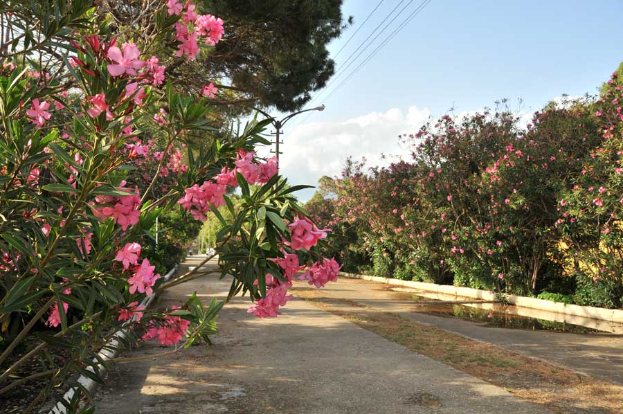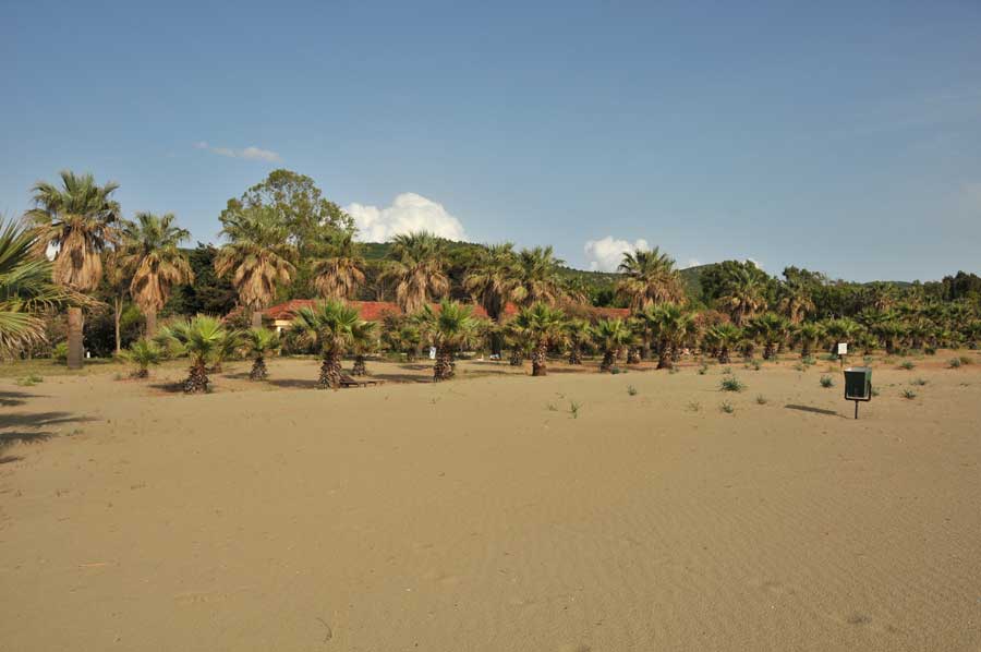 Extensive natural sand and meadow terrain and stands in a eucalyptus forest are another plus of our facility. Along the main path there are lush oleander bushes, to the beach several rows of palm trees.