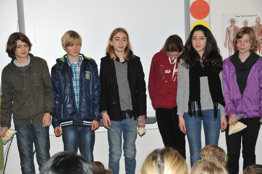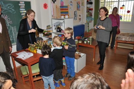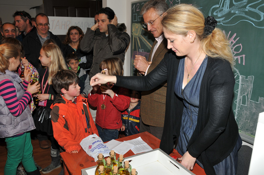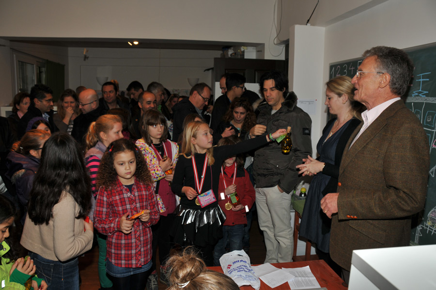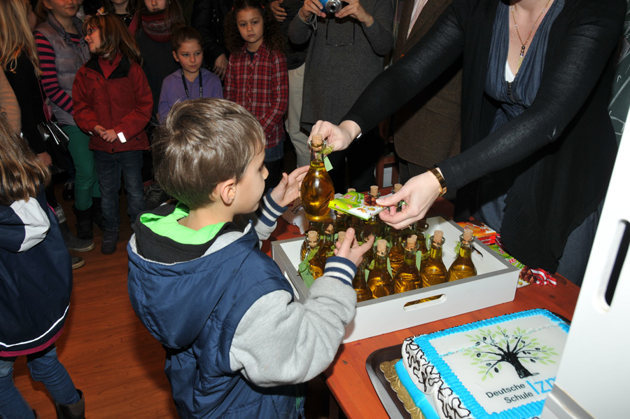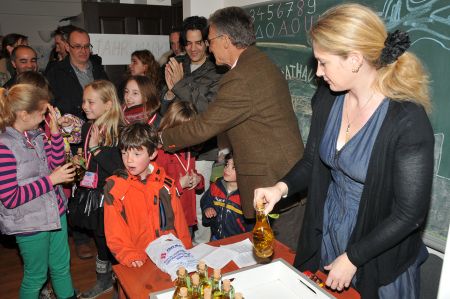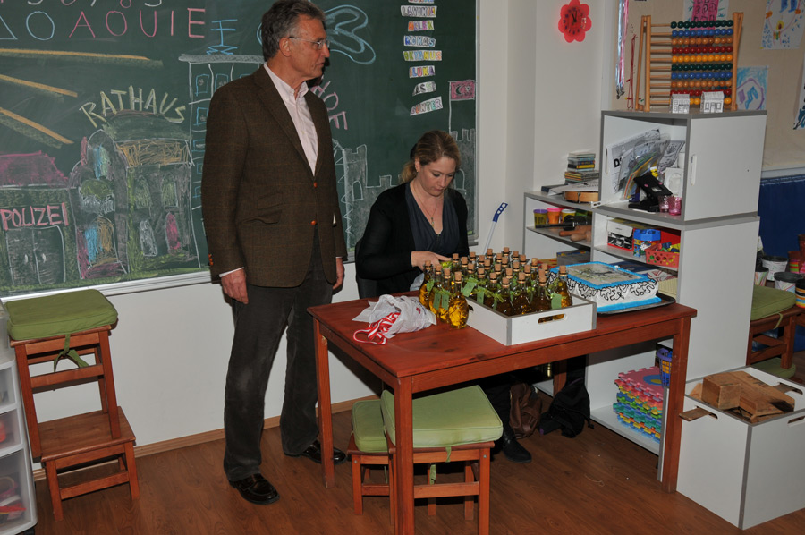 Shortly afterwards, the award ceremony took place in another classroom, with the announcement of the winners of this year's competition for collecting olives. The idea behind this competition was both extremely sensible and creative. Throughout the school grounds there are a number of large, old olive trees that not only look beautiful but also bear fruit. So it is obvious to collect these fruits. Why not start a little competition among the students to see which group collects the most olives. Groups of maximum 5-6 students were allowed. The period of collection was dated between 30.10. – 18.12.2012 fixed. The trees were not allowed to be shaken. Also, only undamaged fruit could be put into the collection containers. After the end of the collection period, the results were clear and since there shouldn't be any real losers, all the students involved received the result of their collection as a consolation prize, bottled and handed out: one bottle of olive oil each. Of course there was also a medal for the winning group.