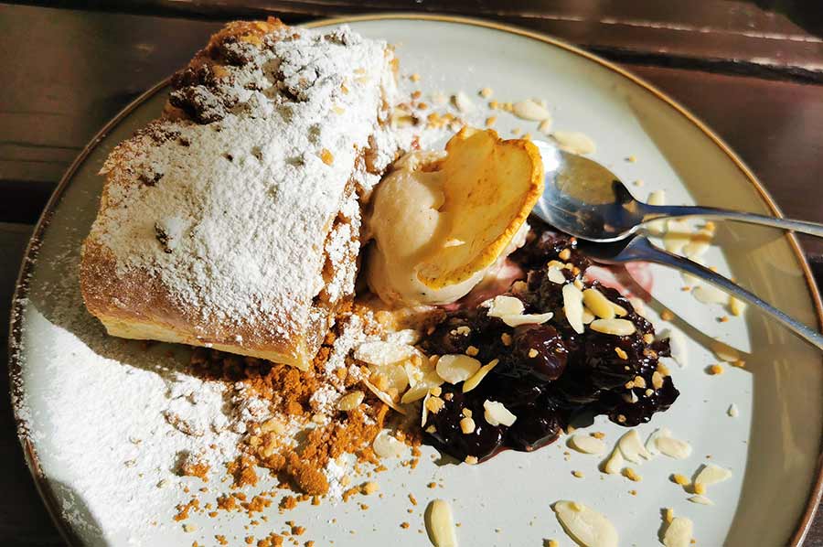 The house “Zur Böhmischen Linde” on Pschesanitzer Platz, built between 1360 and 1370, later served as a town hall and inn, which we also appreciated while enjoying a small snack on the terrace: apple strudel with beer ice cream and cream. We recommend.