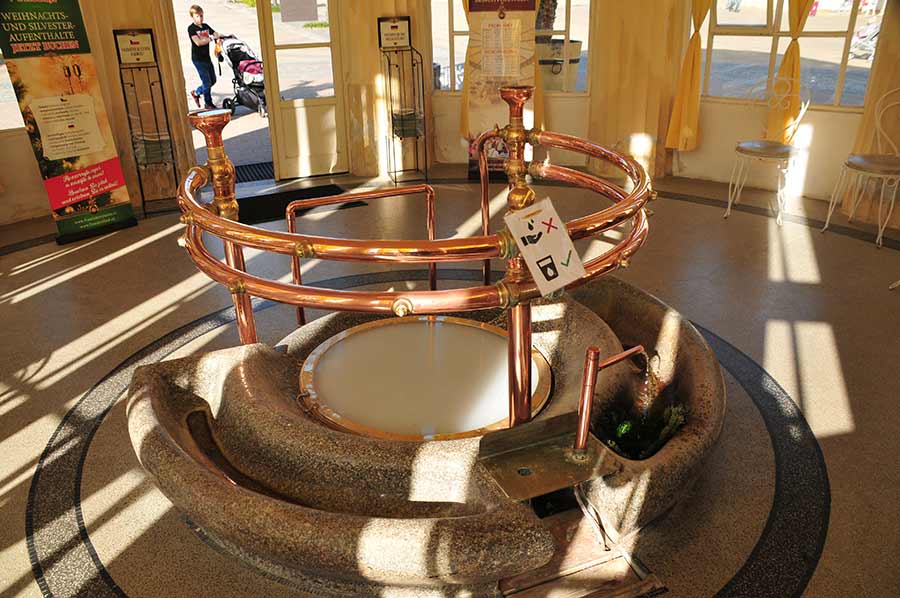 The heart of the spa district is the spa's oldest spring, the Franzensquelle, which is covered with a pavilion with Doric columns (1793). A little south of it are the Glaubersalz springs 3 and 4 (11.5 °C, discovered in 1921, at 52.9 and 92.6 m depth respectively), the Neue Kirchenquelle (14 °C, discovered in 1999, at 63 m depth) and the Neue Quelle (discovered in 1849, at a depth of 40 m).