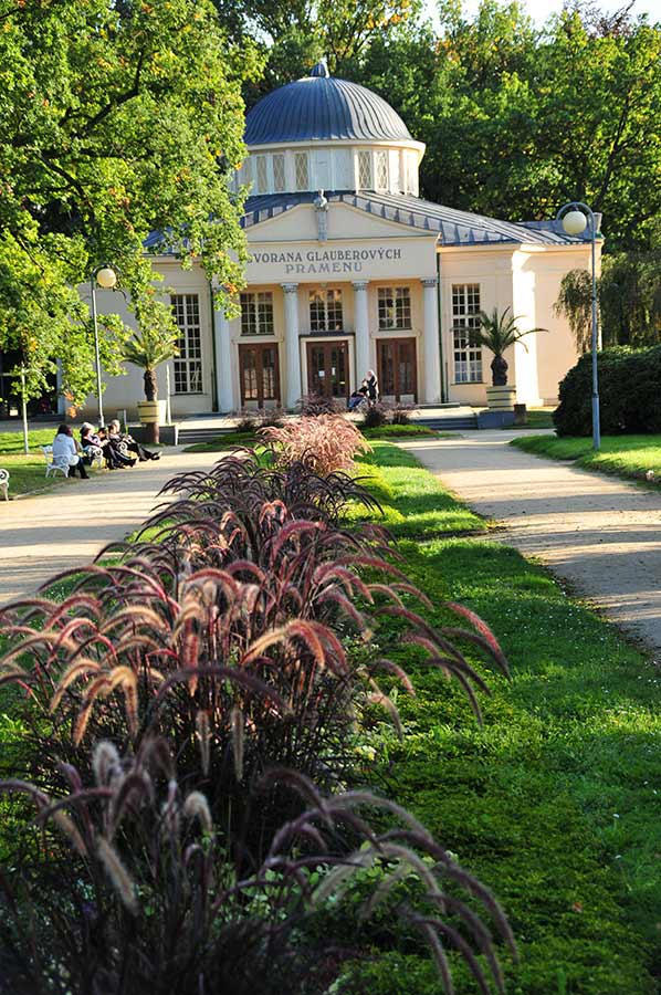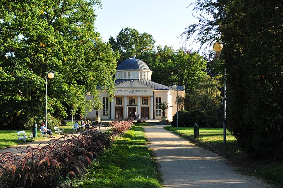The other historical spa facilities of Františkovy Lázně extend west and southeast of the Náměsti Míru square with a monumental fountain from 1962, a music pavilion and the New Colonnades with shops that replaced a previous building from 1912. The Františkovy Lázně medicinal springs and bathhouses are spread over a spacious park with centuries-old trees.