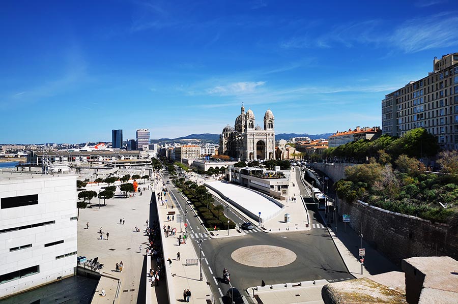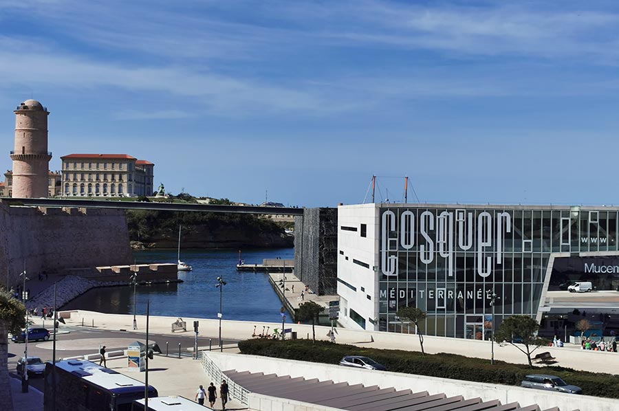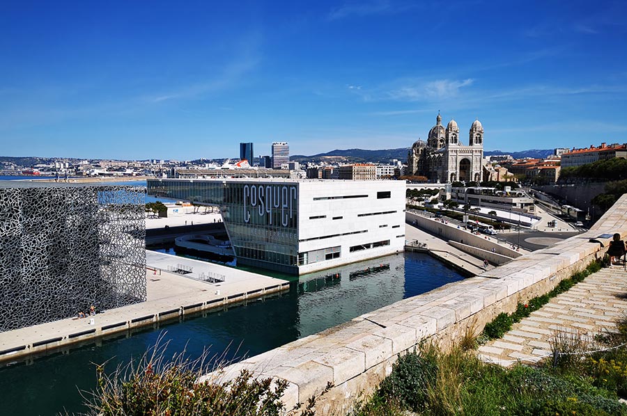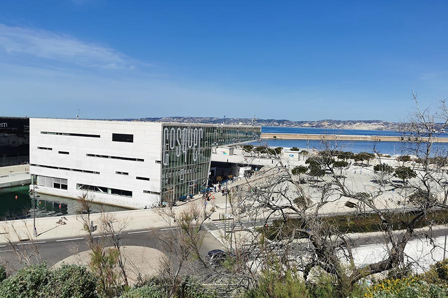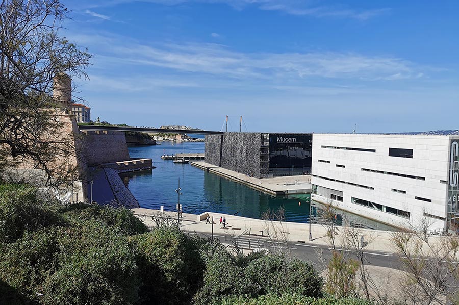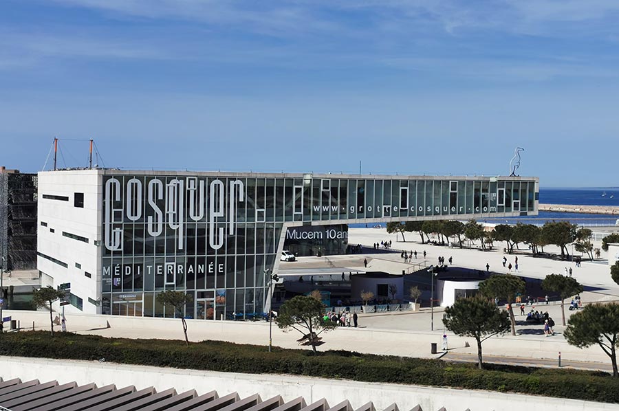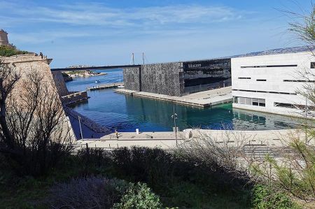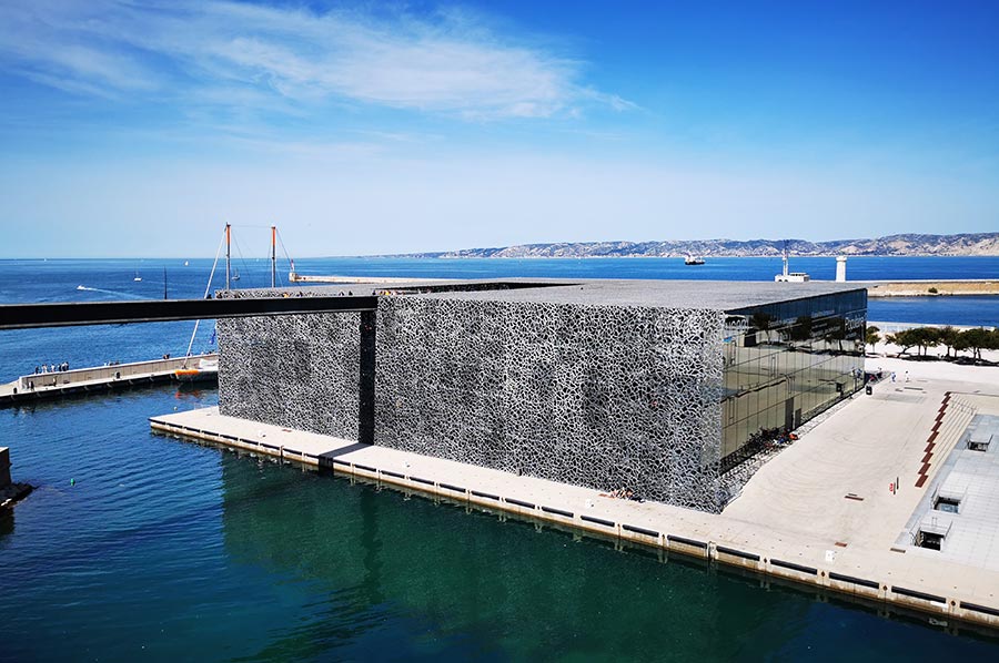 The museum was built for 190 million euros by the French architect Rudy Ricciotti. Mucem is located on the Esplanade du J4, an artificial peninsula at the foot of the Old Port. Next to the Mucem is the Villa Méditerranée. The museum building is cubic and glazed. Two sides facing the harbor water are provided with a net-like concrete construction.