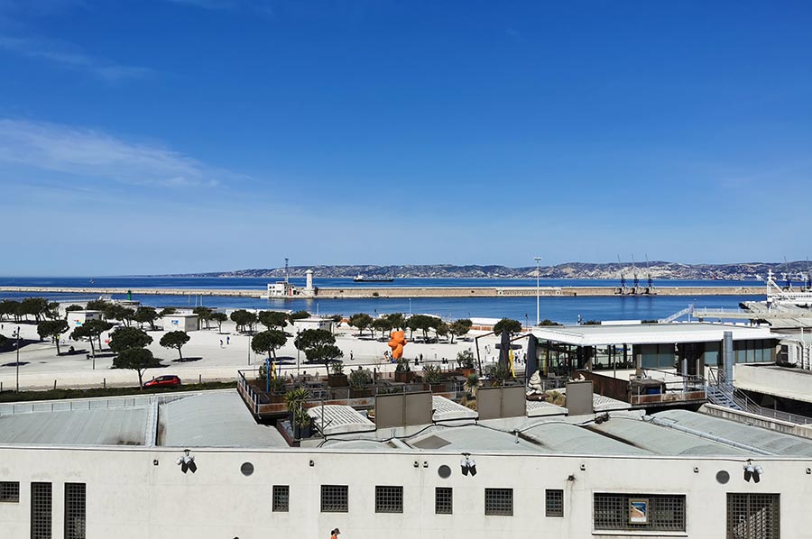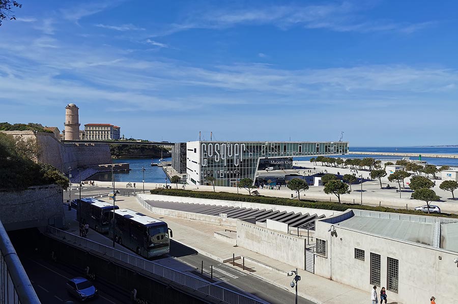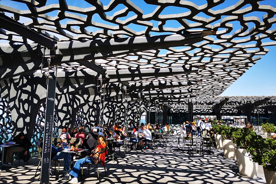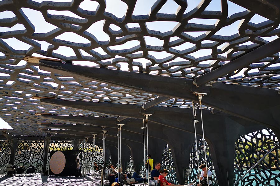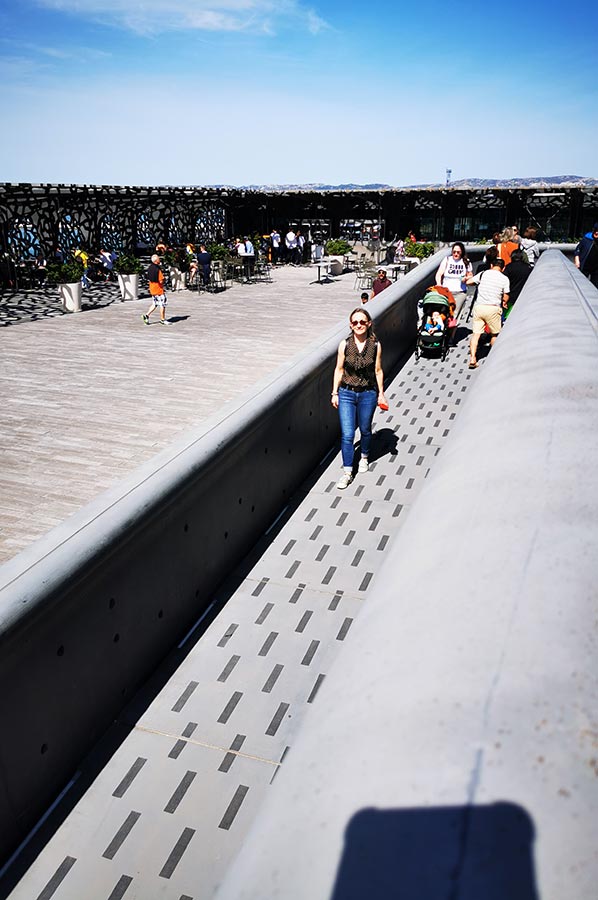 We also use the external tour between the building and the concrete net to once again take a look at the harbor and the Fort Saint-Jean fortress that is now opposite. We were particularly impressed by the impressive open space on the roof, especially since the delicate latticework provides plenty of shade and the large opening always ensures a gentle breeze from the sea.