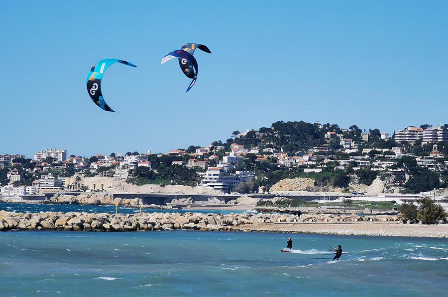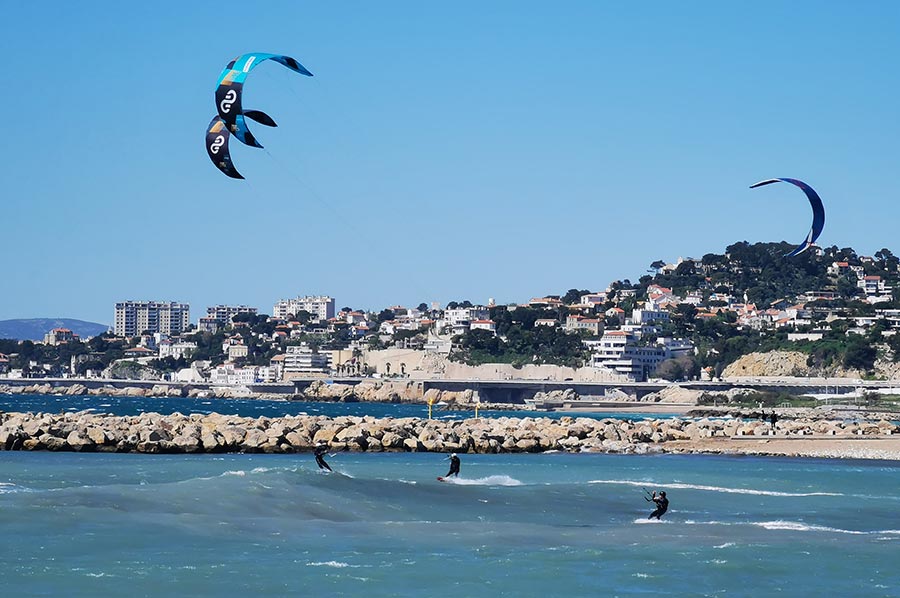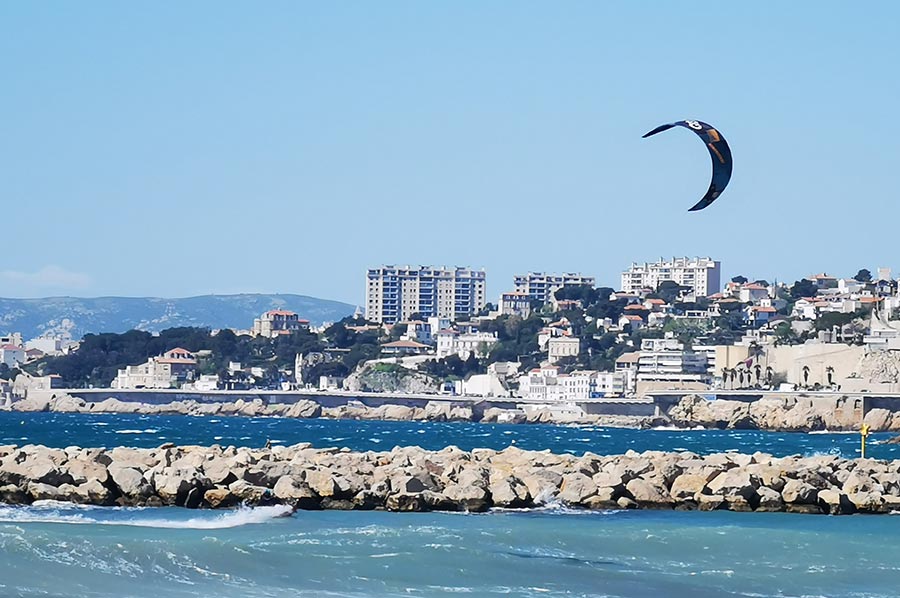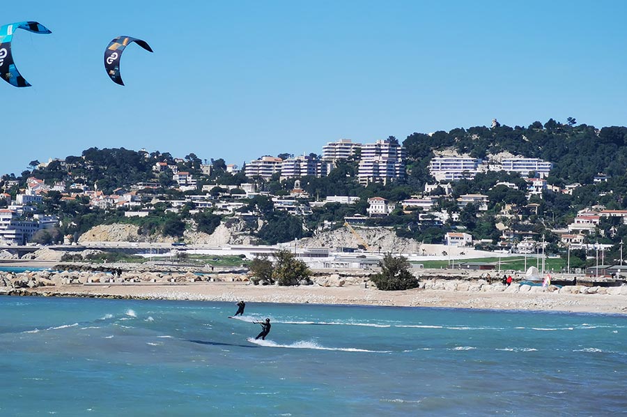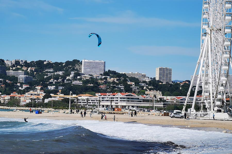 In the summer months, many citizens use the Plage du Prado as a local recreation destination, so there was relatively little going on at the time of our visit, which could also have been due to the Mistral. However, the situation was completely different at sea, as numerous surfers and kite surfers (see our article Mistral and surfing) could be seen. It goes without saying that the Plage du Prado is also often used as a venue for numerous sporting events, including professional hang gliding and windsurfing championships. In July 2008, the Plage du Prado hosted the 2008 FIFA Beach Soccer World Cup, which was the first time it was held outside Brazil.