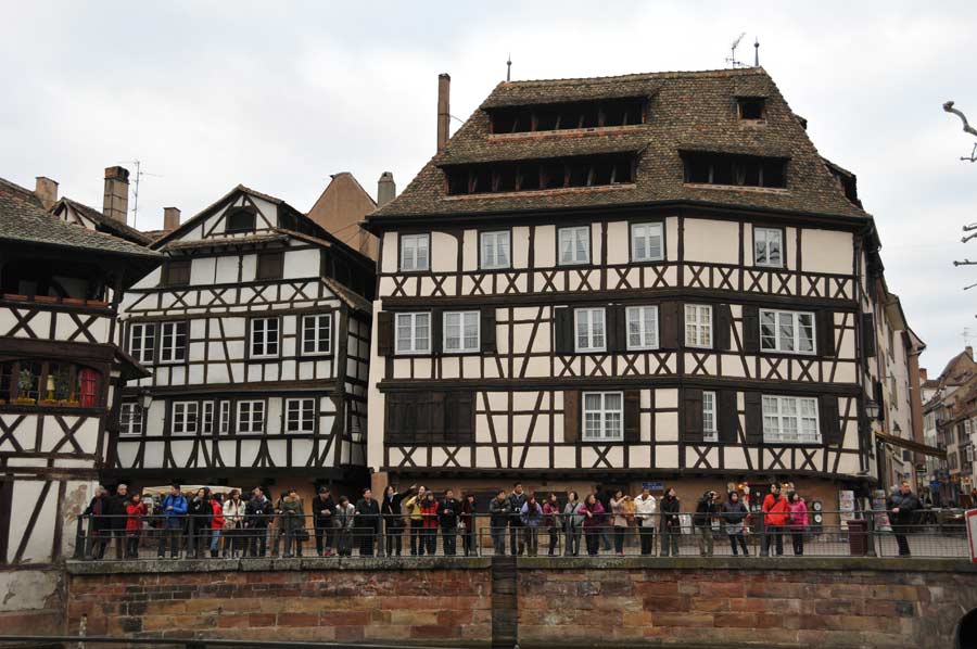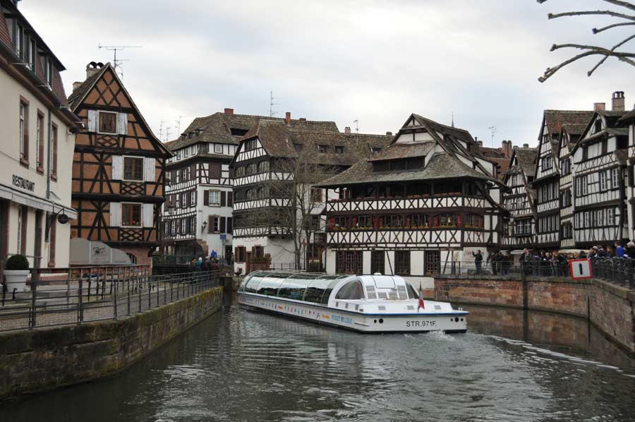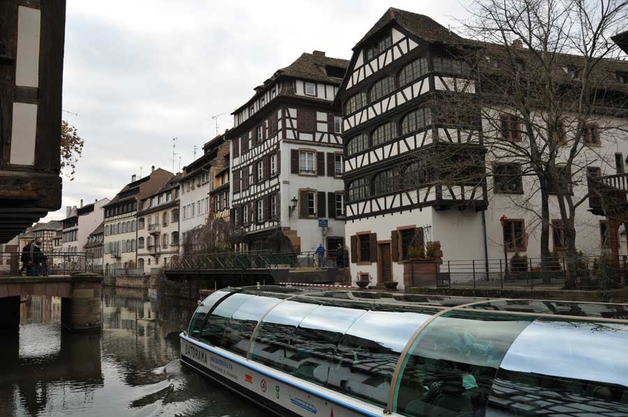 Today we went to another highlight that no Strasbourg traveler will probably miss, the tanners' quarter in the district of La Petite France, which Patrick had already told us about. Here, too, the typical half-timbered houses with, however, very large dormer windows, most of which were without windows. We had learned that many skin tanners went about their business in this quarter and hung up the skins to dry on the upper floors of the roof. It must have smelled terribly at one time, because despite the large dormer windows, the smell often lingered in the narrow streets. Today, the "Quatier des Tanneurs", as the French say, is one of the most important tourist destinations for tour groups from all over the world. We promptly met a group of young Japanese tourists who had gathered on the swing bridge over the Ill for a photo shoot. Shortly thereafter, the whistle of the bridge keeper rang, who had to open the bridge for the passage of a tourist steamer. Only about 100 meters from the swing bridge there is also a lock, which is regularly passed by tourist boats and has thus also become an attraction. A district that alone is worth a visit.