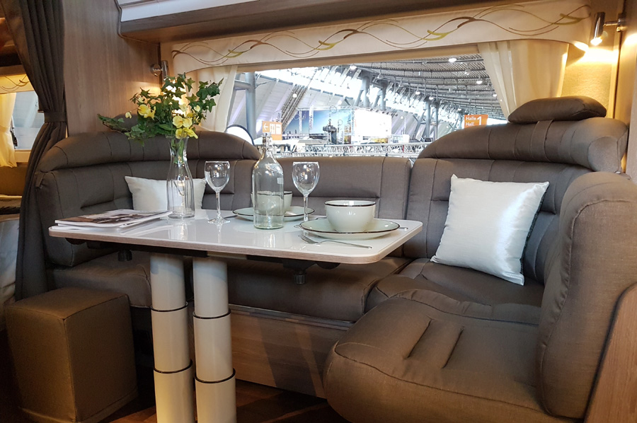 This motor home type uses the driver's cab of the standard vehicle for residential purposes, without deviating from the standard cab. It has an elevated roof over the driver's cab, which usually serves to reach the driver's cab in the driver's cab. The driver seats can be turned towards the living room and combined with a table arranged behind it with a bench (semi-dinette) to form a seating group.