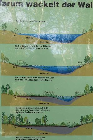 Like the entire Federsee moor, the subsoil in the Eisweiherwäldchen consists of soft sediments that have been deposited in the Federsee during millennia. Just a 20 centimetre thick layer of matted plant roots make the soil / moor accessible. The ground sways with every step, and the vibrations are even transmitted to the trees. The valued walker can literally "let the trees shake". Hence the name Wackelwäldle.