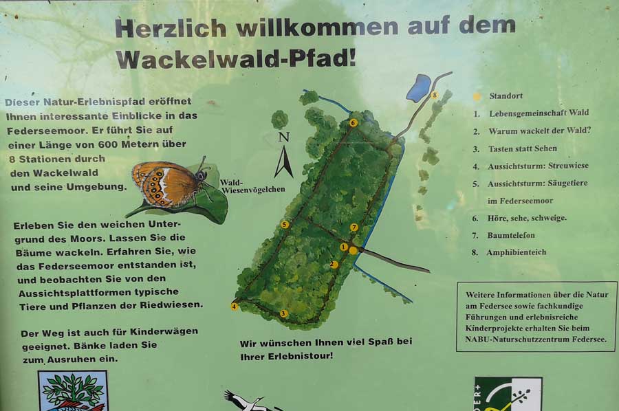 NABU has set up a nature experience path in the wobbly forest. At 8 stations at approx. 600 meters, nature lovers big and small can learn something about the origins of the Federsee moor. Animals and plants can be observed from lookout points. Benches and tables invite you to have a snack.
