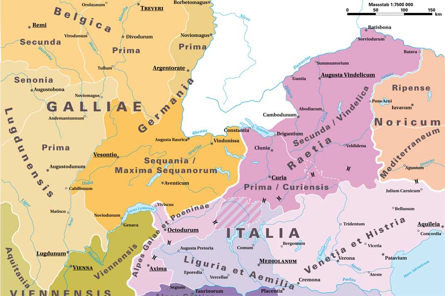 After the division of the Roman province of Raetia in 294 Augsburg became capital of the province of Raetia Secunda, to which, after the end of Roman rule in 450, the Alemanni invaded.
