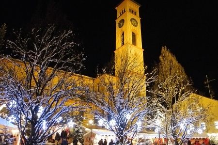 We drove to the foot of Friedberg's castle hill because Georg reported possible parking problems. However, it quickly turned out that there was no reason to worry about a parking space, as there were enough free spaces. We therefore had the opportunity to walk through the snow along the fortress wall up to the old town, which also, in different colours, was festively illuminated and also exuded a lot of Christmas flair. The stalls of the Christmas market were set up around the Herrgottsruh pilgrimage church from 1753, which is one of the most beautiful churches of the Bavarian Rococo period.