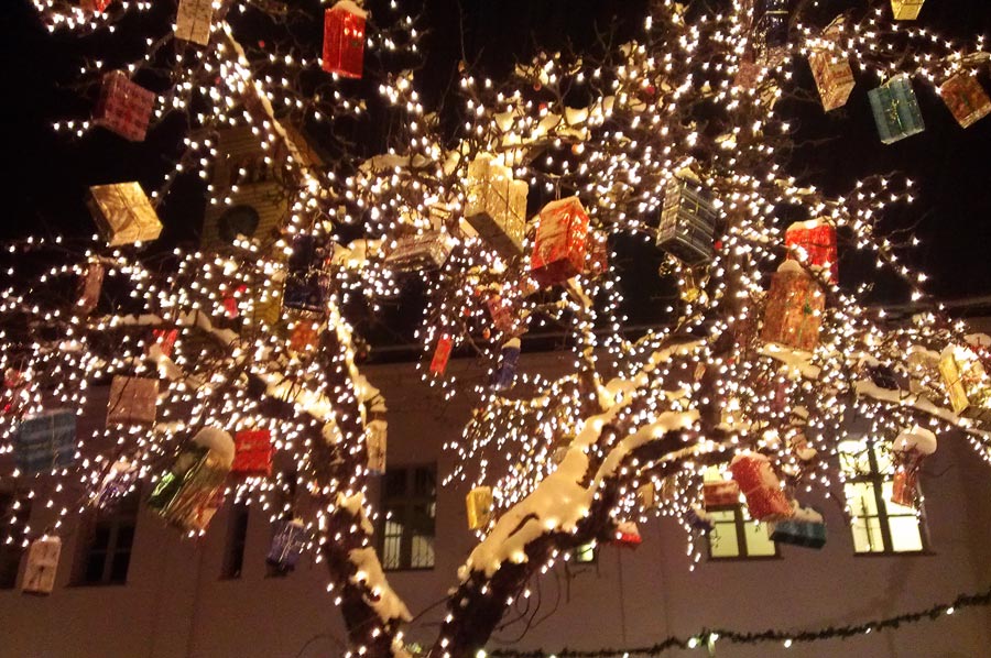 Slowly we started feeling hungry again, so we discussed what to do. No wonder, with all the scents and scents that drew our noses. The decision was quickly made in favor of Schupfnudeln with sauerkraut, a dish that we had never heard of before. And it was simply delicious, what more can one say. Now we were drawn to a side street of the Christmas market, where we were surprised by such an idyllic spot that one could hardly find words. Only a few wooden stalls framed a small square with a few trees in the middle. Still covered in fresh snow, strings of lights twinkled in the two tallest trees, dozens of presents hung neatly wrapped as Christmas presents from the branches, and an open fire roared in an iron hearth. Standing tables were set up all around, where visitors and locals had gathered. It could only be described as magical. So cozy that even the cold was hardly felt.