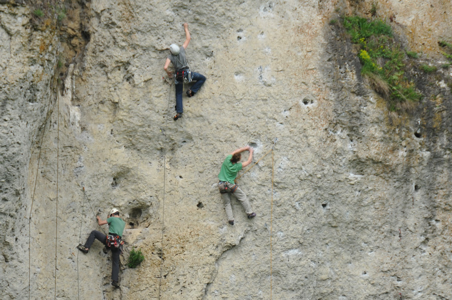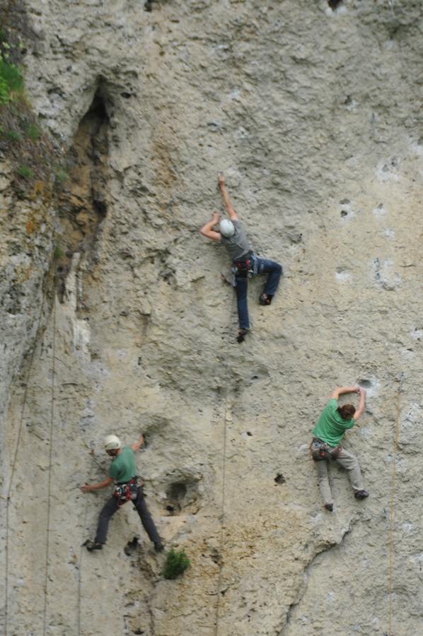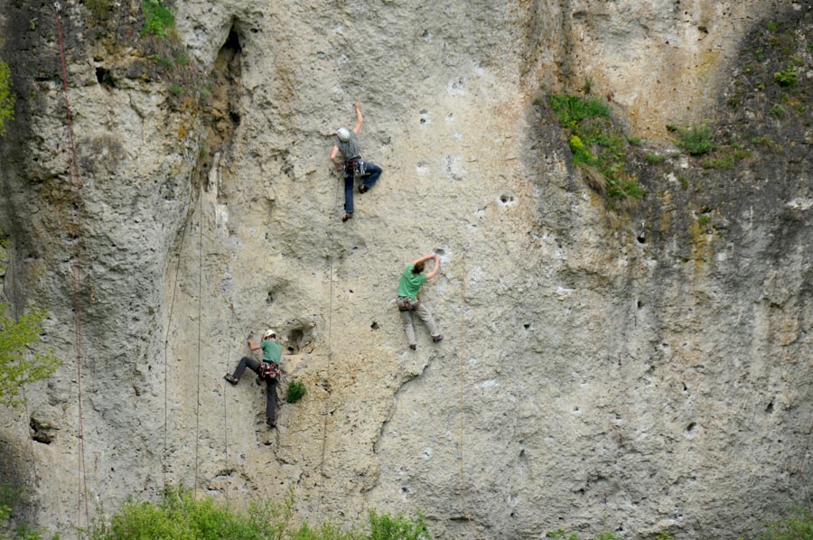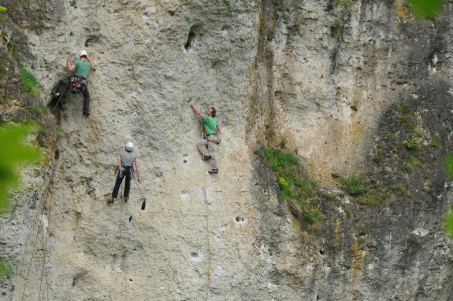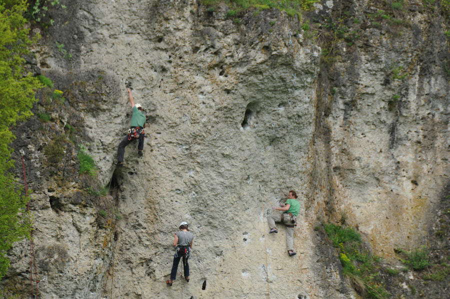 During our tour through Franconian Switzerland, we drove in the Wiesenttal along the scenic country road towards Ebermannstadt, which also led along a steep rock face. Here we noticed a few climbers who, because of their colorful clothing, stood out clearly from the grey, weathered rock faces.