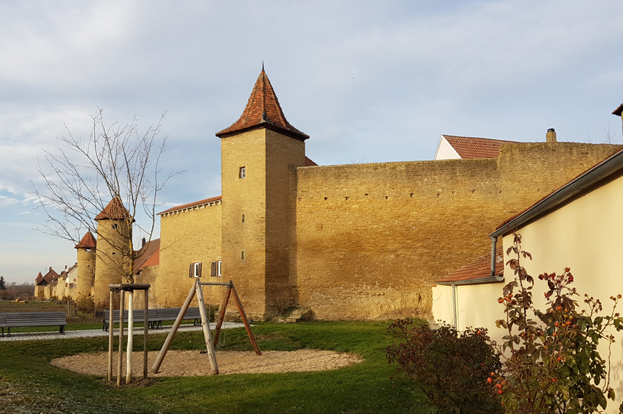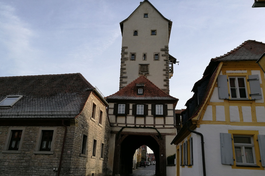 The medieval cityscape with the largely intact city wall, now 18 towers still recognizable and two gates are preserved. The lower gate, which points towards Kitzingen, with a pointed arched passage was built around 1400. At the beginning of 1600, it received another floor in half-timbered construction. During the reconstruction the Mainbernheimer replaced the former fall bridge by a fixed bridge and completed the two-storey half-timbered building with a hipped roof to the gatehouse in 1787. Here the royal gatekeeper lived. In the direction of Nuremberg, the Higher Gate can be seen. It was built at the same time with an arched passageway. The rolling slots for the drawbridge, the brackets of the heavy gates and the bars for closing, as well as a Pechnase (hot material was pured onto enemies from here) are still clearly visible here. The reconstruction with an eight-sided tower and mansard roof by Johann David Steingruber took its end in 1765. Here the visitor can enjoy the view of the city and surrounding countryside from the Türmerwohnung (home of watchman).