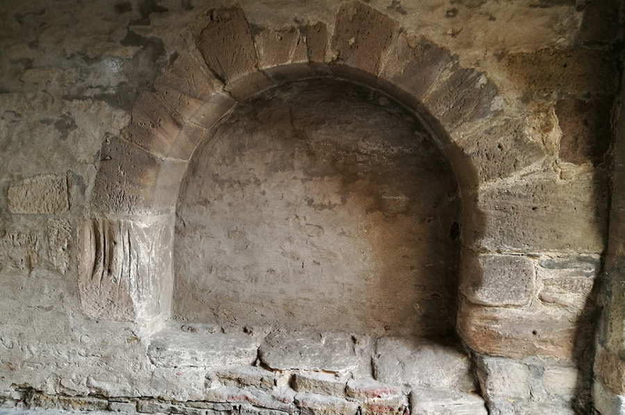 The entire wall is resting on stone arches. In this way, material could be saved. There are only a few pedestrian breakthroughs and a subsequent larger opening of the walled wall behind the evangelical church. In the reconstruction of the church forecourt in 2011, the wall course and tower location were fixed in the ground.