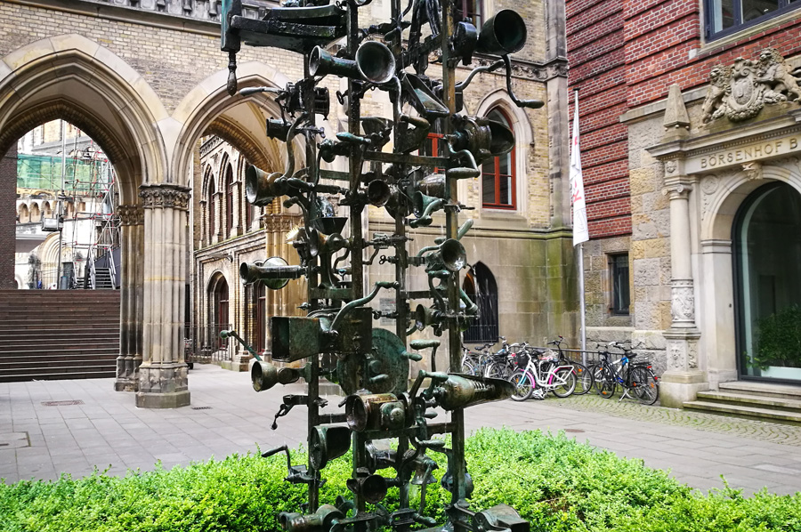 On the opposite side of the market square you will find the Schütting, the house of the merchants. The east side of the square is occupied by building of the citizens of Bremen, on the west side there is a series of four buildings from the 18th and 19th centuries. Between the Schütting and the Bremer Baumwollbörse there is the entry to Böttcherstraße, a total art work created between 1922 and 1931. Following the path, you will reach Martinikirche on the river.