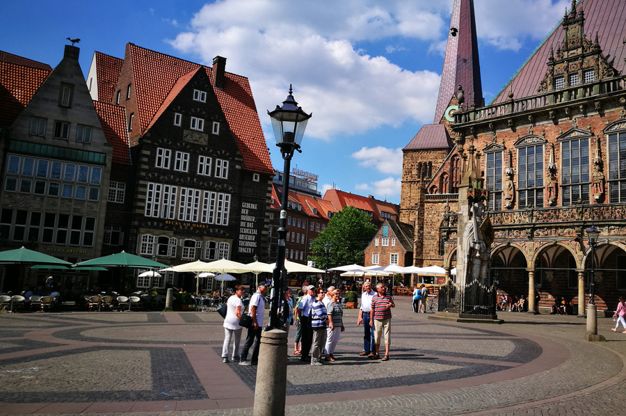 The Roland is the center and a landmark of the city. Roland's original head is exhibited in the Focke Museum. During the Second World War it was replaced by a copy cause of fear of destruction by bomb attacks. Its view is directed towards the St. Peter's Cathedral, which provides visitors with the Cathedral Museum and the lead cellar. Next to the Roland stands the fascinating town hall, in its Ratskeller wine is served and sold. The so called famous Bremen city musicians, also a landmark of the city, can be found on the west wall of the town hall. Here the German fairy tale road ends. It is followed by the former Council Church of Our Lady.