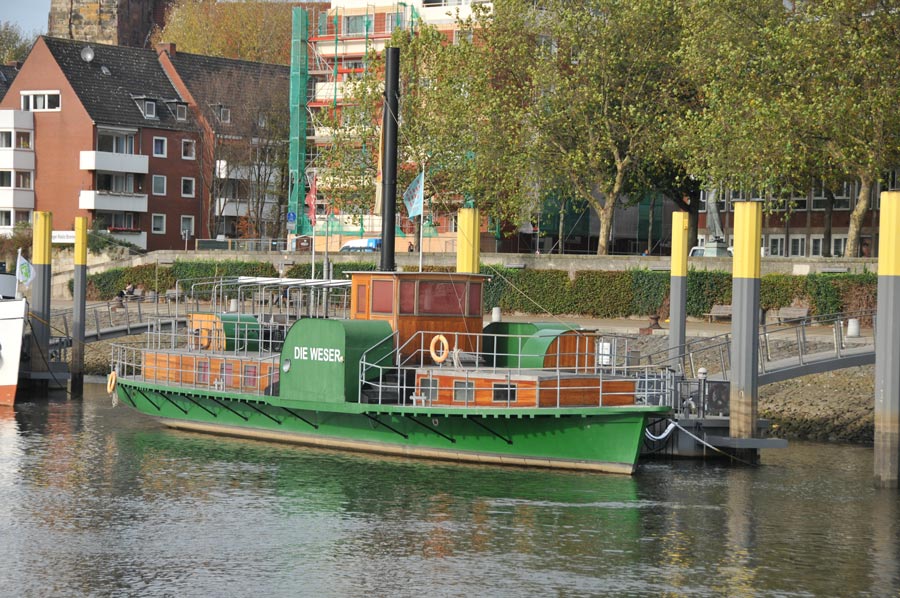 After just a few minutes' walk, crossing the Mayor Schmidt Bridge, we arrived at the Schlachte, where our ferry was supposed to depart at 1:30 p.m. Even from the bridge there was a wonderful view of the historic ships moored along the battleship, some of which are used as restaurants or hotel ships. Arriving at the departure pier, we were amazed at how many visitors had decided to take a harbor tour despite the late season. After punctual departure and a warming cocoa, we went to the foredeck to capture the Weser tour in pictures, a "seafaring" tour guide gave the relevant information.
